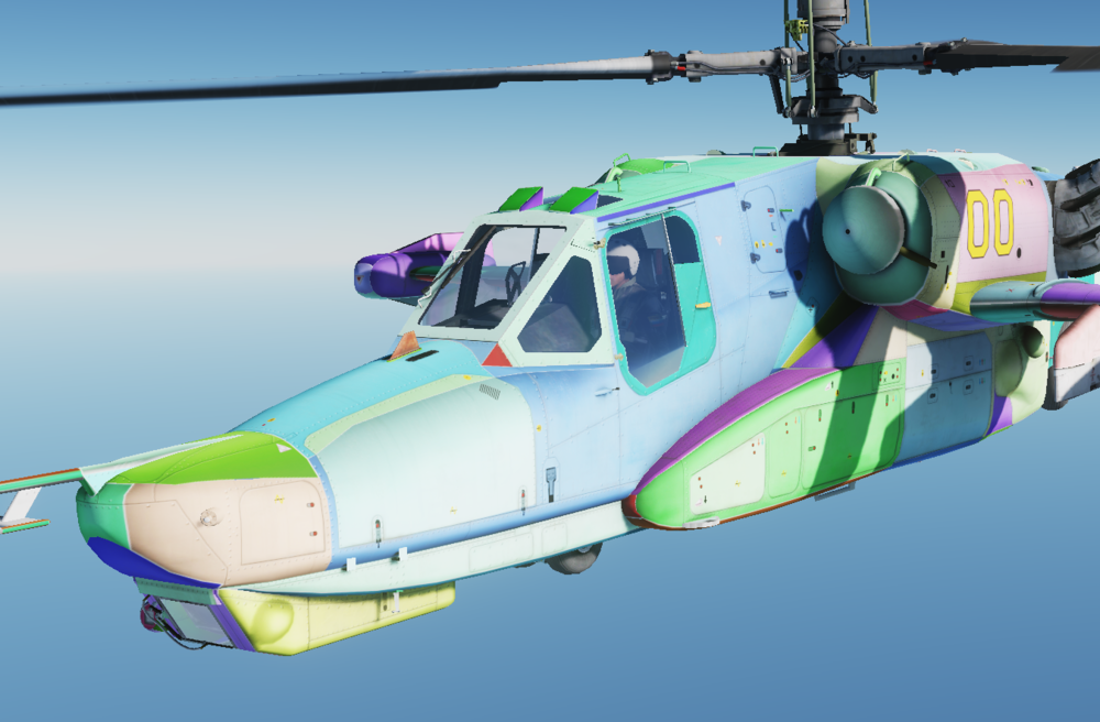 I would second that advice on the panel finder. I've done something similar on mine when trying to find parts. I'll essentially just grab the pen tool in photoshop and roughly outline entire panels on the template, then fill them with a set color. Usually I'm just working on one chunk of the model, so I'll use a handful of colors. When working on the Ka-50, it ended up looking like this: Then in terms of lining things up between two different parts of the template, one thing I would do was to draw a line on a separate layer to be deleted later. Then I would adjust the corresponding line on the other template until they matched up, and edit the camo patterns or lines after I knew where to cut things off. Another useful trick is to zoom in real close in the Model Viewer and see where you're at and where you want to be on the model using whatever visual references like rivets. I've lined up plenty of camo lines on the first try by going "Okay, I'm 4 rivets from the bottom line and need to actually be at the 6th rivet". It can be a painful process, but I always enjoy the work. I might get a little too obsessive about lining up things, but I guess as the skin creator, my eyes are drawn to any imperfections that I'm sure the average person flying with your skin won't even notice. -