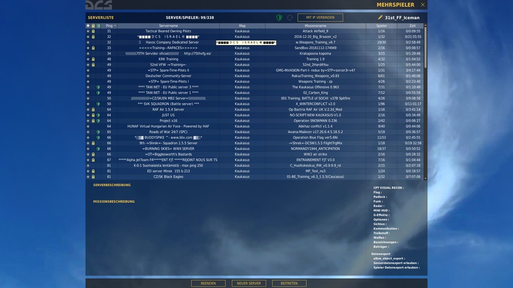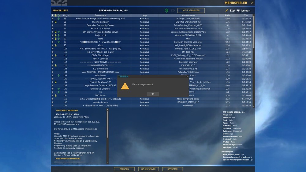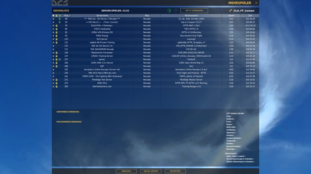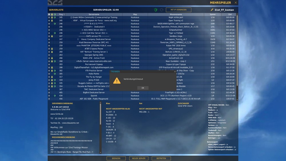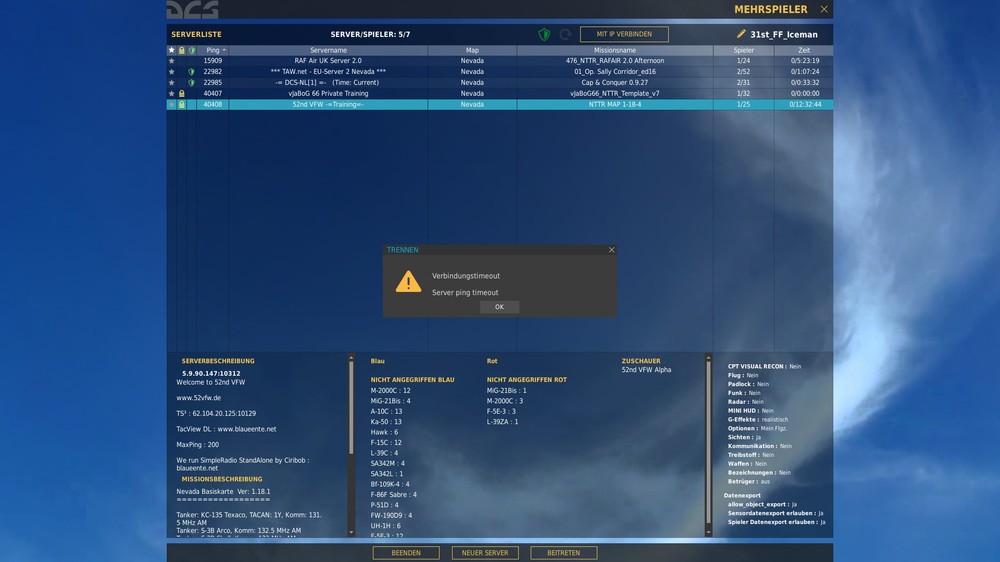 Hallo zusammen @ Raku habe alle schritte gemacht wie in dieser Liste beschrieben Hilfe bei Problemen (Troubleshooting) + F.A.Q. Mit dem Ergebnis wie vorher auch siehe neue Anlage von DCS 2.0 ps die pings von der 52nd waren 76 ist ein Permaneter Server wie ich mich verbunden hatte! Gruß Ice