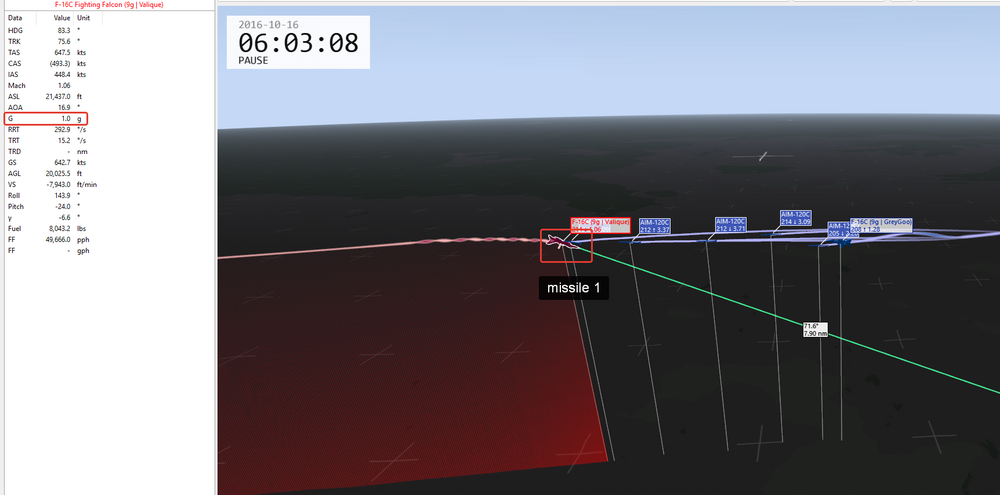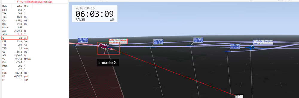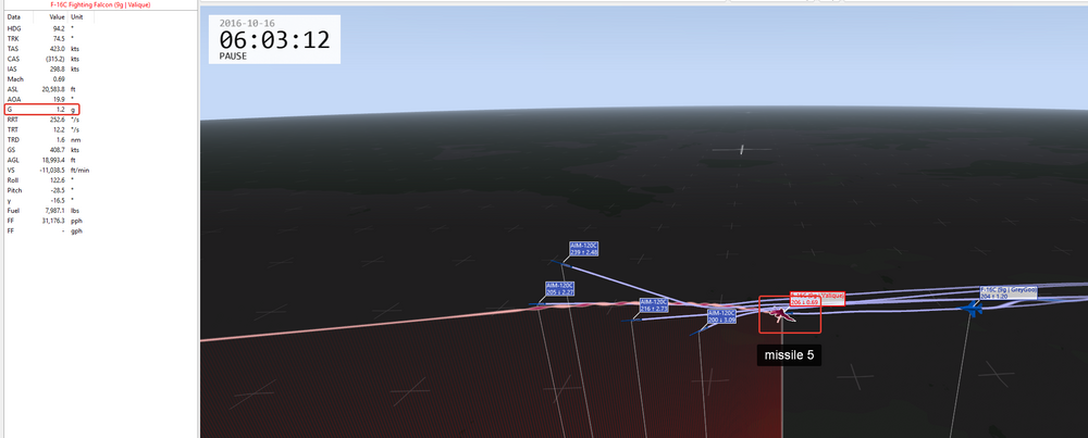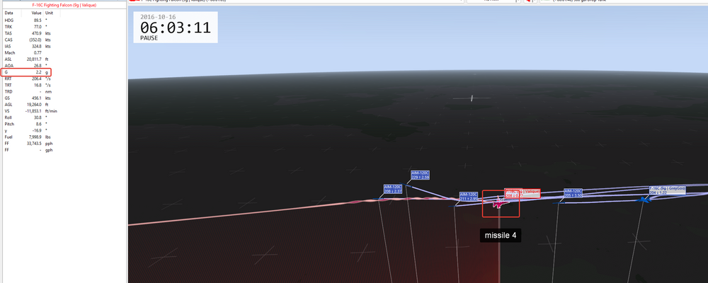 Да, спасибо, согласен. По скорректированным вводным прикладываю 2 трека: 1. Barrell_Roll_120_5g_4g Тут 3 серии пусков -перегрузка 5g + ролл. Уклонение от 6 ракет 120с -перегрузка 4g + ролл. Уклонение от 2 ракет 120с, третья попала -перегрузка 4,5g + ролл. Уклонение от 5 ракет, шестая попала Повод подумать 2. Barrell_Roll_R77_8g_9g -попытка уклониться от Р77 c любой перегрузкой + ролл. Безуспешно - ракета попадает при достаточной энергии 3. Картинка для привлечения внимания - как это выглядит со стороны, ролл на 5g Barrell_Roll_R77_8g_9g.trk Barrell_Roll_120_5g_4g.trk