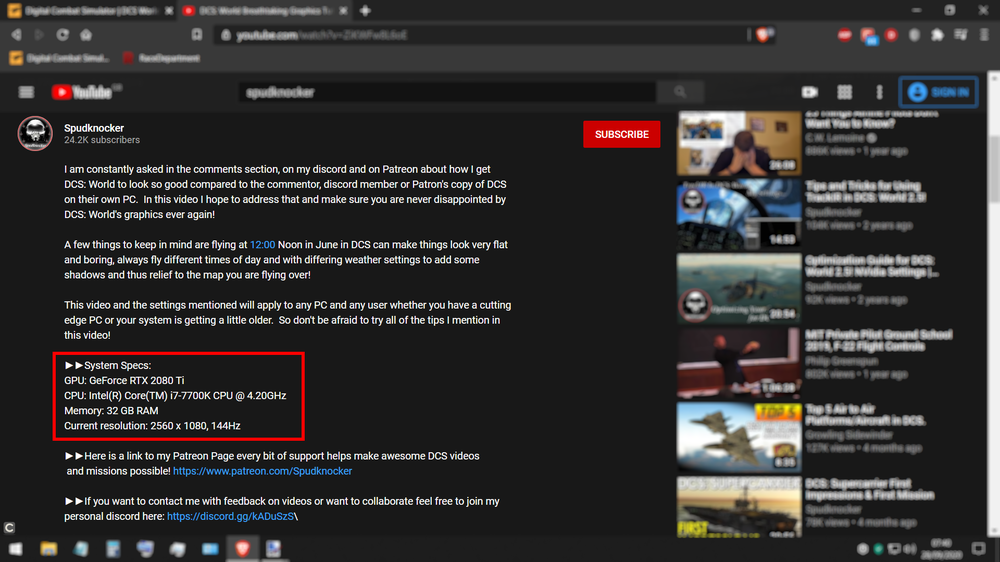 Roger @Svsmokey, These are all good suggestions and i will try certain settings out most likely ;). However, there are so many conflicting advice that it becomes difficult to try everyone's settings/solutions. I set my settings at Spudknockers initially as his system is near(ish) in spec to my own; Well, in fact you would argue that my specs are more powerful...the only difference being is the gfx card, which given the reports and reviews/tests i've viewed, shows not much of a gain from the Super to the Ti!. In fact, some reviewers and tests show the RTX 2080 Super to be more powerful overall...but again, i only have their word for it ;). Here below are Spudknockers settings that i screenshot from the said video, for reference: So my question is: If my system in comparison with Spudknockers, then why at my resolution and 60fps(vsync), why is my performance worse?