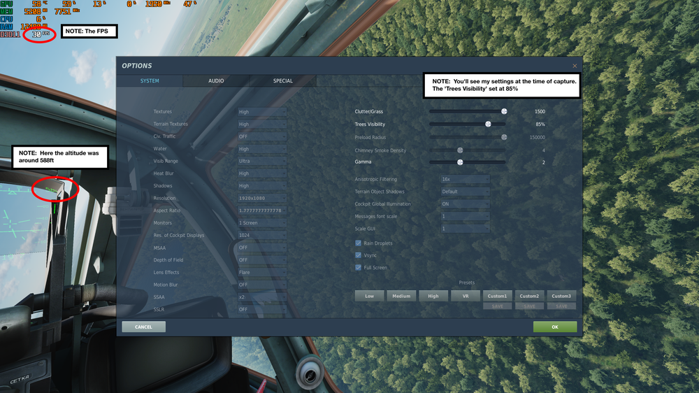 Right guys!...i may have stumbled upon a solution (for the time being) As you can see from the screenshots attached, i added SSAAx2 and lowered the shadows to 'medium'. Firstly, i didn't really want to reduce shadow quality...HOWEVER... From the results, it clearly shows a huge increase in performance; in fact, while i was flying, the only fps drops incurred were negligible... FPS drops were at most were 4fps, which given the settings 'increase' somewhat, was for the time being acceptable. Let's face it, these tests i'm doing are a bit on the extreme side as i very much doubt i'm going to be flying at those heights and, as i've mentioned before, the higher i go the fps drops don't occur. So, in essence, i lowered the shadows to medium; set the SSAA to x2, and lastly set 'trees visibility' to 80 on the slider. Not perfect by any means and i may do some more tinkering later ;)...but as it stands, i will leave it at those settings. I actually didn't see any significant change between 'high' as apposed to 'medium' shadow setting - again negligible. Screens: