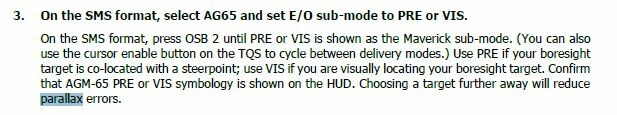 Although we may consider a reference in the manual regarding parallax or other limitations, it is common sense that sensor operation need to take this into account. The sensors are not positioned in the same spot on the aircraft, the TPOD is set up on the right chin hardpoint, while the Mavericks are on the wing pilots. They will have different perspectives if you align too close. And that will add up if you then aim in longer distances afterwards. The consideration must be: at what range will I fire a Maverick missile? Certainly above 2nm. So that's where my alignment focus must be.
