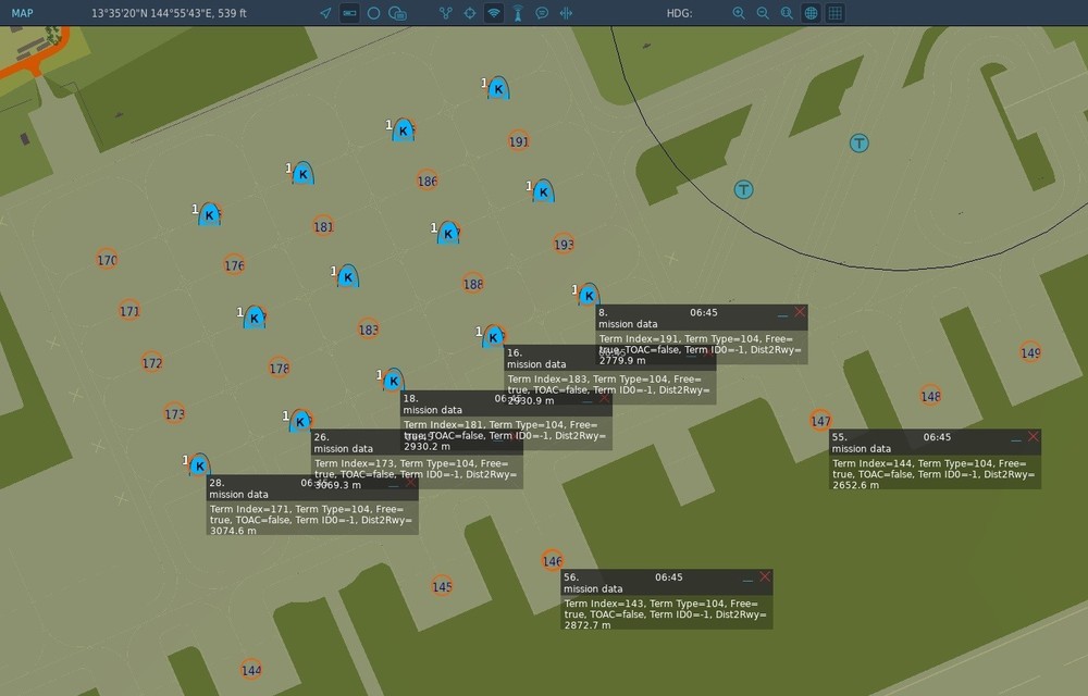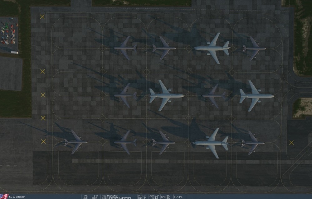 The parking spots referenced are all coded with the terminal type 104, which is OpenBig. This means that KC-10 and KC-135 (and C-17, etc) AI aircraft can spawn here, with the pictured results that are guaranteed to result in AI aircraft crashes. I included the parking info for spots 146 & 147, which are also type 104, and have no problems handling these large aircraft. May I suggest changing the terminal type for these spots to 72 (OpenMed), assuming that would - or could be used to - block these larger aircraft? Thanks