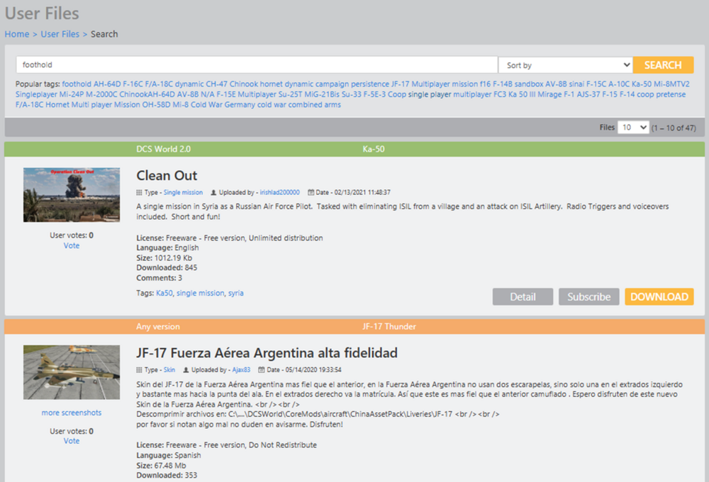 I believe that this is the sad and salient point. We both know that few people, if any, work at your level of expertise, @Actium. What makes me sad is that ED seemingly invests so little into their customer experience. If "Joe Simpilot" comes to DCS, he takes a look, is unimpressed. Maybe he hears about "Foothold" or "Pretense", the two missions that almost single-handedly saved multiplayer for a couple of years. Someone tells him that he should download it, and DCS will look much more interesting. Problem is: even if you can get Joe to go to UserFiles, searching for "Foothold" gives him this: Joe neither knows nor cares that there is a great mission available, hidden somewhere. He's just been given the finger by User Files, knows a good-bye when he hears it -- and DCS has lost a potential customer - simply because other games handle their customers a lot better. That is heart-breaking. I believe that ED should invest more into their DCS user experience. The current experience has a lot of room to improve. But this is only half of the tragedy: imagine Joe miraculously receives a link to Foothold, and downloads it. As @Kang pointed out: Now what? What does he do with that mysterious .miz file? I believe that a game should shield their users from silly minutiae like this. And I find it supremely disquieting when the company that wants to sell you 'quality software' seemingly can't even get a simple SQL query right on their main user site. It makes them look bad, and it reflects badly on their reputation. @Actium that was a clever, and to me exceedingly helpful post - thank you! What pains me is the fact that it is necessary at all, and that for most DCS neophytes, their visit to User Files is going to a one-time experience. They shrug and then they are gone. Most players aren't looking for a challenge to get their sim to run. They are looking for a good time. I think that ED can and should do better. -