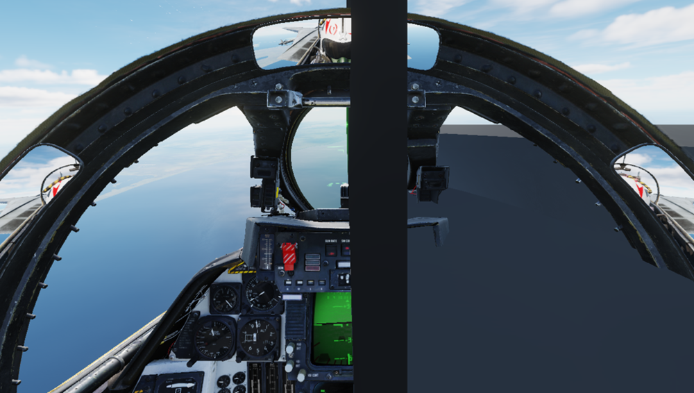 Not sure whether this has already been reported, but I have noticed a graphic glitch when inside the F-14B (the F-14A does not have this glitch). I believe this glitch was introduced with the October 28 update, but it is only with the F-14B. When looking forward, the right half of the cockpit is getting obscured (happens both from pilot and RIO position): Looking to the left side: Looking to the right side: