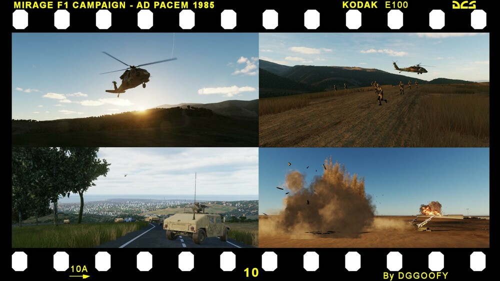 Hi dear fellows, I'm pleased to announce a new campaign for the Mirage F1: Ad Pacem 1985. is available for download now! It takes place in Jordan. You're a Jordanian pilot on the brand-new Mirage F1 EE, and you're going to help your country and Lebanon start on the road to peace. Good luck to you! 16 fully voiced over missions. All kind of missions : CAP, CAS, Strike, RECO, Ferry, etc. You'd better know the Mirage F1 EE very well before. Full use of the INS, fly in formation and of course, use of all kinds of weapons! Documentations and briefing. **************** HOW TO INSTALL ROYAL JORDANIAN LIVERIES INTO THE EE VERSION *************** 1) Open the folder X:\Saved Games\DCS\Liveries\ 2) If not already done, add a new folder named : Mirage-F1EE. So you have : X:\Saved Games\DCS\Liveries\Mirage-F1EE 3) Create 2 subfolders : Jordan Air Force and Jordan Air Force Blue Scheme 4) Open the folder X:\DCS World\CoreMods\aircraft\Mirage-F1\Liveries\Mirage-F1CJ 4) Unzip both zip files into the into the folder you've just created at point 3) Thtat's it! Cheers DG-GOOFY Direct link to download : https://www.digitalcombatsimulator.com/en/files/3332404/ AUG-1st-2023 : Initial Release. null