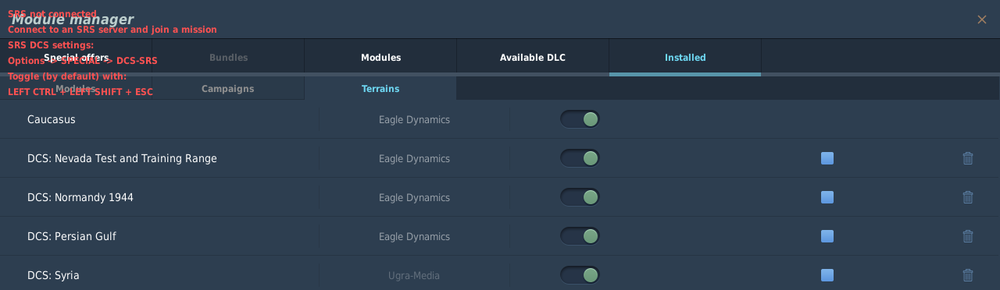 Only 2 mods - the A-4 and the high digit SAMs, neither of which should be causing issues as the servers that run them are populated. I have a sneaking suspicion it may have something to do with the way I installed Syria. Tl;dr: SSD very full. Had to Symbolic link the downloads and Syria folder on another drive. Now, Symlinking other terrains such as Normandy and Nevada has never been an issue (as you can see from it showing missions in the singleplayer for them), because I could download em on the same drive because of their small size, then move/symlink the terrains and it's all good. Syria on the other hand was too big to download, ergo I symlinked the download folder to the separate drive with the other 2 terrains, which downloaded it fine, but then a popup comes up that there's not enough space on the original hard drive. At this point I have Syria in full on the symlinked downloads, but not in the symlinked Syria folder I made. So I just copy the contents of Syria from _downloads to the Syria terrain folder and hey presto, that worked. Do you think I just "uninstall" Syria using the module manager, and with a copy of the Syria files already in the downloads folder, re-download it and hope it detects files already there and fixes it? -