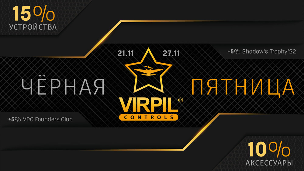 Привет, ВИРПИЛы! Отличная новость для любителей скидок! Команда VIRPIL Controls объявляет сегодня, 21-ое ноября, понедельник, началом “Чёрной Пятницы 2022”!!! Промо акция продлится целую неделю (по воскресенье включительно)! С 21 по 27 ноября в магазине для ЕАЭС — https://virpil.by — скидки на все ключевые устройства: РУД, базы, ручки, педали и панели — 15%*! На все аксессуары действует скидка 10%**! Для самых активных ВИРПИЛов существует возможность увеличить свою выгоду приняв до 4-го декабря участие в квалификации Shadow’s Trophy 2022. Достаточно показать гоночный результат на любом вертолете, зарегистрироваться, и на сайте virpil-servers.com запросить купон на дополнительные 5% скидки! Наиболее оперативные пилоты смогут обновить свои кокпиты и с уверенностью улучшать результаты для выхода в следующие этапы турнира. Борьба за призы Shadow’s Trophy 2022 с самого начала была на порядок активнее, чем в прошлому году: только за первую неделю участники завершили более 8.000 кругов, что уже превосходит суммарное количество квалификационных результатов 2021 года. Поэтому крайне важно быть во всеоружии и выходить на старт максимально готовым технически и морально. А что может лучше поднять настроение и зарядить оптимизмом, чем новый, крайне необходимый и качественный девайс? Акция “Чёрная Пятница 2022” действует с 13:00 (UTC+3, МСК) 21.11.22 по 23:59 27.11.22. Следите за новостями в нашей группе ВК. Если вам понадобится квалифицированная помощь или появится желание обсудить наши новости, это можно сделать на форуме VPC. Также, пообщаться посредством текстовых сообщений или голосом можно в Discord-канале проекта VIRPIL Controls Community Servers. Приятных полетов! Команда VIRPIL Controls. * — 20% для членов клуба VPC Founders Club ** — 15% для членов клуба VPC Founders Club #VIRPILControls #ShadowsTrophy