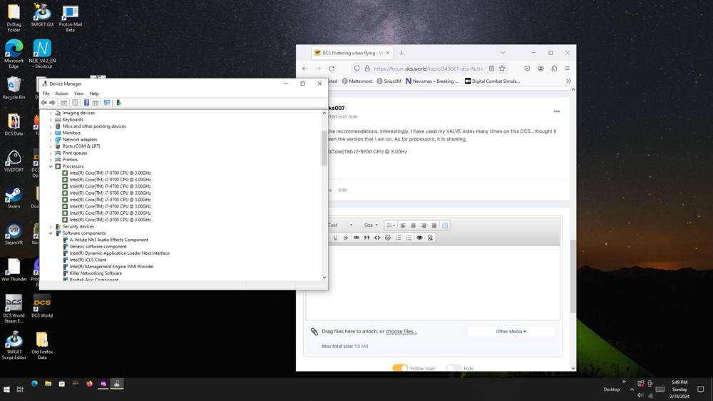 While flying DCS, F-18 in VR, the program freezes up and "flusters" to the point of not being able to use DCS. I am using Windows 10, GTX 2070, 16 GB RAM, plenty of hard drive space. I am using DCS flight through Steam VR. I have a VALVE Index headset. Using DCS version 2.16. I have re-set all controls several times, MSAA is at 2X and I have tried 4X. Not sure why this is happening, any assistance would be grateful.