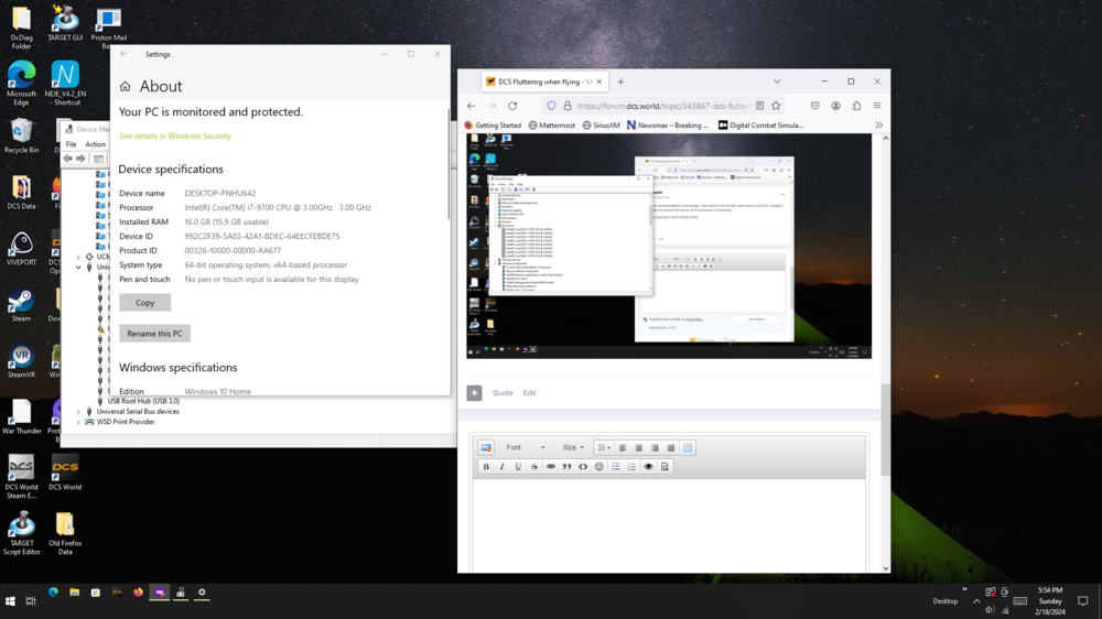 For some reason, when trying to fly the F-18, there is an extreme amount of jittering to the point the images/flight looks up. Below image attached is how I have things set up. Running windows 10, 16 GB Ram, i7 9700 cpu. Any help would be appreciated. Also flying using VR steam