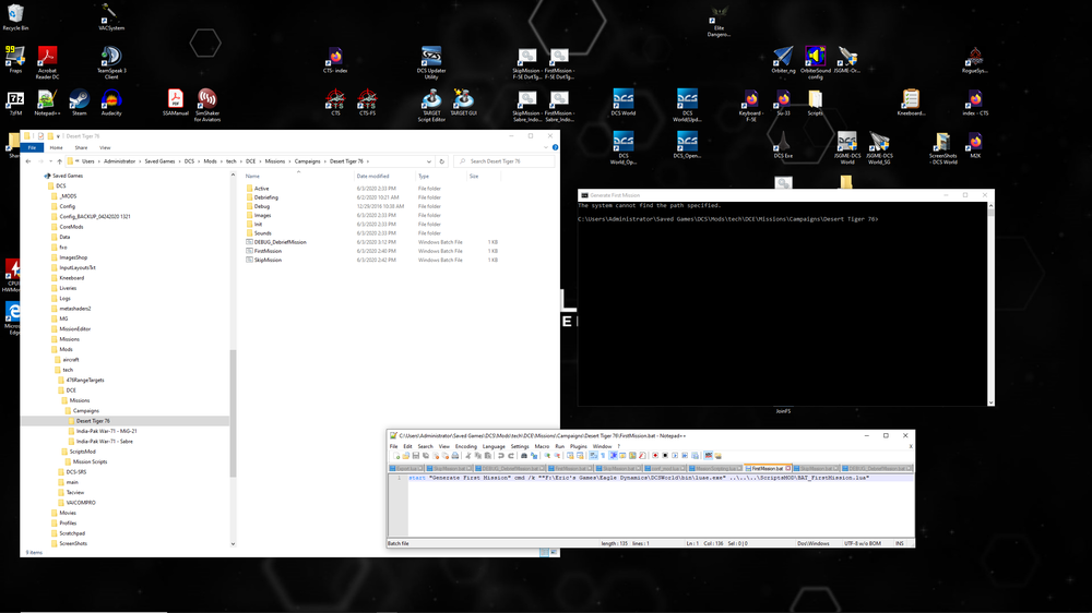 Hey Eagle, I dl'd your latest Desert Tiger 76 Campaign and installed it exactly as in the pdf. I can't get the First Mission bat file to work. It say it can't find the file. Must be a bad path somehow. You edit the bat file so it points to your main DCS install right? My game installed at--F:\My Games\Eagle Dynamics\DCS World. So, what should I edit the bat file path to look like? Thanks pal.