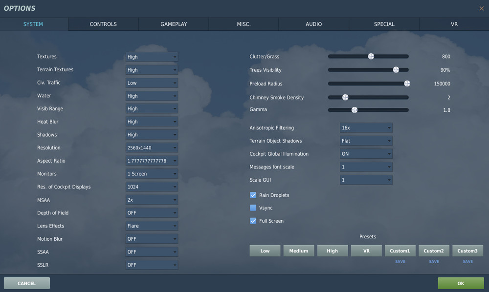 4. Thank you for the suggestion! Honestly, I don't think the extra cost in fps is worth it for the visual quality it gives. Although it's a very noticeable feature if you're looking at static images and scenery, when you're actually flying missions in a dynamic environment it will be practically negligible. This however is entirely subjective and it's up to each one's personal preferences and gpu headroom. You are however missing the point of this post: have you tried the suggested settings and gained any fps?