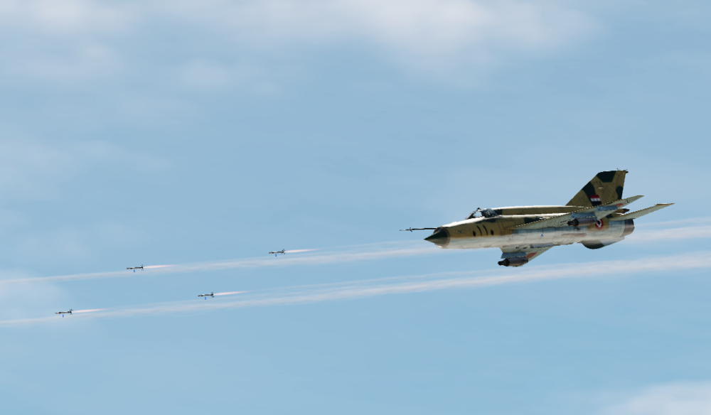IRL rocket pods usually have large flames coming out of the back when rockets are being fried, in DCS this is not the case, in real life you can not see the flame of the S-5 when out of the pod, in DCS you can also the smoke is to dense/visible on the S-5 as for the S-8 the smoke is not as dark as it should be and again the flame is missing although a visible flame at the rear of the rocket is realistic EDIT: after the apache update the rockets are some what better but the same issues still mostly persist pictured a MiG-21 firing S-5/UB-16 rockets, the smoke should be less visible and the flame should be invisible