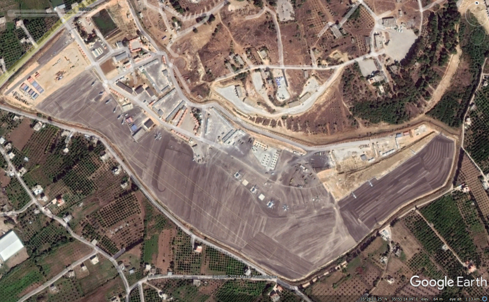 an updated version of this with more images, there is a Syrian/Russian helo base missing, its on the west coast of Syria, it hosts Mi-24, Mi-8 and some Ka-27's its at N 35.28.10.25 E 35.55.14.09 elev ~64m this image was from 2016 (around when our map is set) the base sits 6.50km 338 degrees north of Basel Al Assad what it looks like in dcs, (i added the grey to show the outline of the base) some images that as far as i can tell are from the base