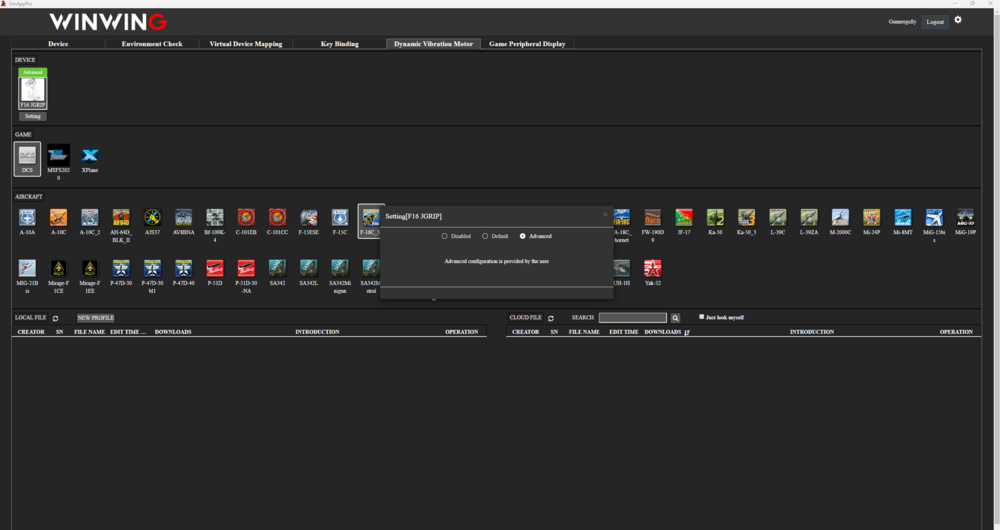 Recently bought an Orion 2 Base and F-16 stick with shaker. Vibration is working fine in game when using "Default" mode, but i'm wanting to change some parameters more to my liking. However when i select "advanced" mode the "cloud files" are not populating and i am unable to create a "New profile".... i also no longer have any vibration in game. Switch back to "default" mode and vibration works again. Using the latest SimApp version, anybody else having this issue in "advanced" mode ???
