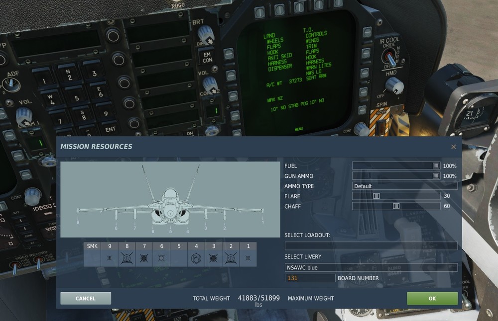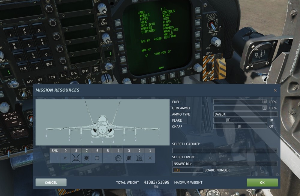 Hi all! I noticed a discrepancy between the weight displayed in the Rearm&Refuel window and the one displayed in the Checklist page... Here is an example: AIM-9X / AGM-84H / AGM-65E / AIM-120C / * / ATFLIR / AGM-65E / AGM-84H / AIM9X Rearm&Refuel: 41883lbs Checklist page: 37273lbs I use the checklist page to assess my weight for trim setting on the carrier and before landing to see I'm within weight parameters. Something I am missing? Which one is the true weight? Which one affects FM within the sim?