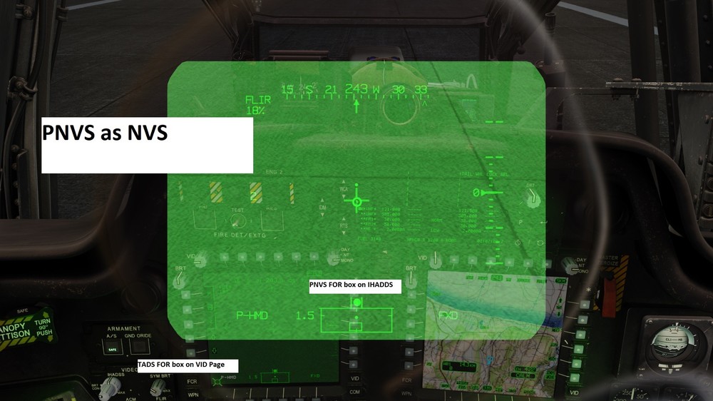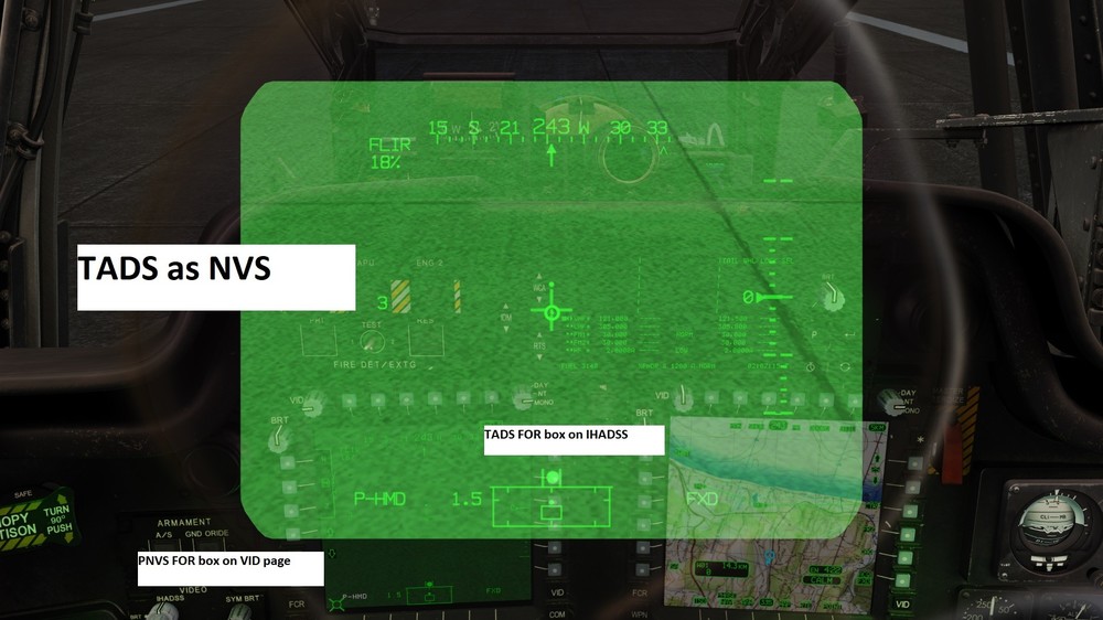 I've just noticed that when you've got the VID page set to your HMD and with the VSEL (P-FLT or C-FLT) symbology selected, the selected NVS (Night Vision Sensor) uses the wrong, in fact the opposite, field of regard box symbology. With PNVS as NVS the box is for TADS, and with TADS selected as NVS the box is the PNVS one. (This FOR box is the big box in the HAD with the Azimuth and Elevation tic marks etc.) The FOR box that's projected on the IHADDS is correct, and changes accordingly when you use the collective NVS select switch. It's the VID page symbology that is wrong. Bug is seen in both PLT and CPG cockpits. Edit: Screenshots of issue for clarity. Please enlarge and squint to view..... HMD vs VID Page.trk