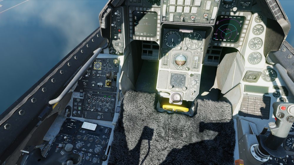 I also noticed the bloom effect seems too yellow/green. Attached a couple screenshots. In the cockpit, it is a little more subtle, but look on the center console where the left leg should go. This effect seems to be there on multiple maps for me. I think it is as straightforward as just tweaking the colours of the bloom effect. -