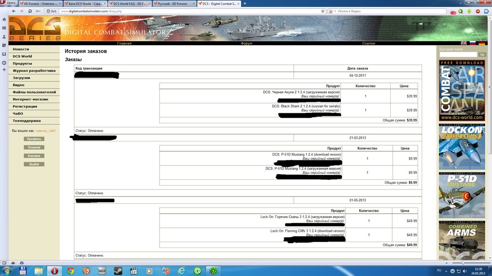 После авто обновления, с целью поиска аэродрома с работающей системой инструментальной посадки и отработки навыков взлёта посадки, создал миссию приведённую здесь. После выхода из неё 100% вылет с предложением поиска решения проблемы в инете. Треки выдерал из папки Temp. Решил проблему пере установкой Мира с удалением папок установки и в Saved Games. Качать версию 1.2.4.12179 от сюда не стал, (пока буду скачивать такой объём появятся инсталеры версии 1.2.4.12547). Поэтому установил имеющуюся у меня на компе DCS_World_1.2.4.11652_168. P-51D Mustang и Горячие Скалы 3 установил из менеджера модулей. Акулу тоже попробовал, но мой русский ключ не подошёл, хотя покупал на прямую у ЕД, по интернациональной цене. Пришлось удалить. Инсталеров версии той же, что и мир у меня нет. На оф. сайте другие, качать предпоследнюю версию мира бессмысленно. А-10С вообще покупал у 1С, и соответственно установить не могу.