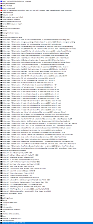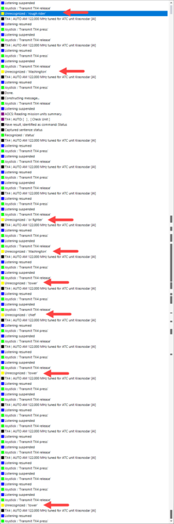 Hi Max, OK so I tried the OPER switch. No joy. It's not that VA/Vaicom Pro aren't hearing me. It seems as though they're not picking up on who I want to talk to. Both Windows Speech and VA understand "Washington", "Tower", "Chief" et al all with a high 90% success rate. And both VA/Vaicom Pro know that I want to speak to "the nearest tower", or "nearest AWACs" etc. But it seems as though specific destinations are not being recognized. So it doesn't know "Marshall" or "Washington" or "Tower" I think it's just picking the nearest tower etc. Which would explain also why it doesn't know what do with "Chief" or "Sarge". Do you suppose this is a lua issue?
