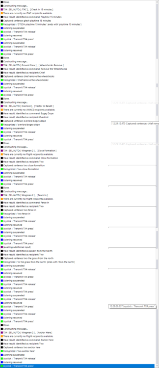 Ok so if I just breeze through the command quickly without any pausing: "ChiefRemoveTheWheelChocks." "JTAC,Playtime15Minutes." etc. It looks like everything is working fine - outside of DCS. Maybe it's just me and I'm an idiot. I know that VPSX commands are supposed to be given in an expeditated manner, but I could have sworn I used to get a beep after addressing my recipient ("Chief," beep "...remove the wheel chocks."beep. ; "JTAC", beep "...playtime 15 minutes. beep. ") but maybe I'm wrong. I'll fire up the hornet after Sunday lunch and try this out again. I'll let you know how I make out. The hard part is going to to be unEasy Comms and trying to figure out where to map three additional TX buttons.