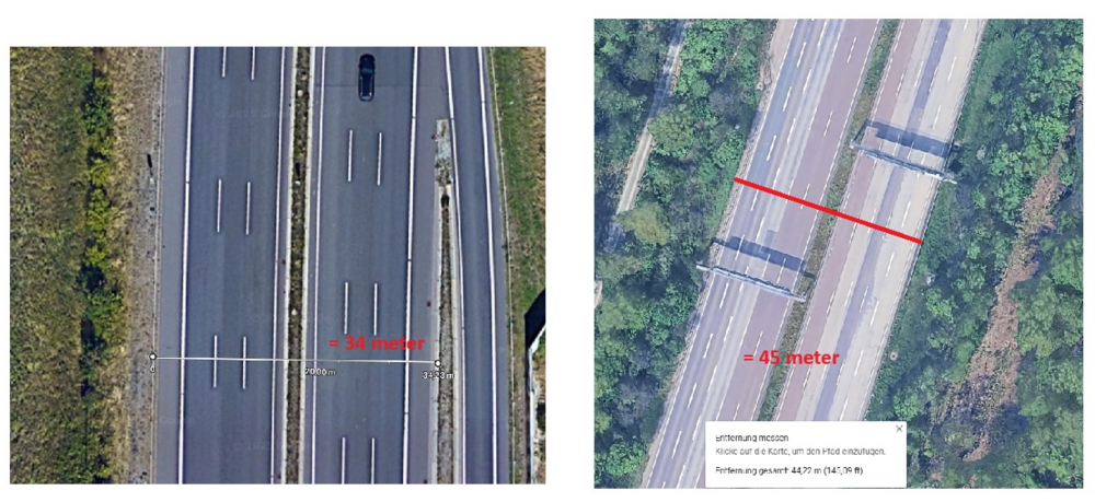 Pre 1990 german motorways usual dimensions were between 3,5m-3,75m per lane plus aditional 0,5 meters either side next to it. The Space in between opposing direction lanes was three to four meters in width. Motorways pre 1990 usually had an extra stop lane for broken down vehicles which added another 2meters minimum each side in width.