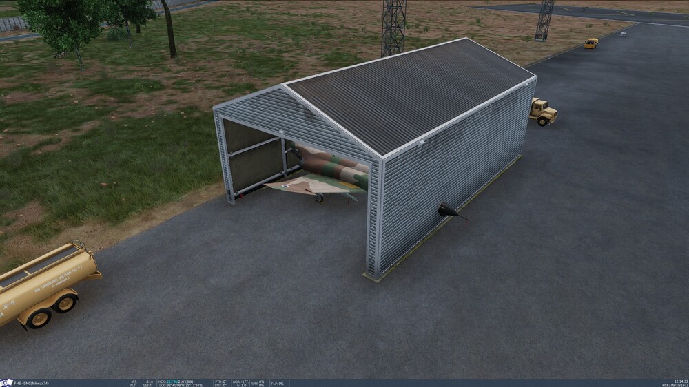 In the same mission (Homs strike) there is a shed on the left side of the taxiway next to RWY 33 with an F4 in it (basically as you stop for hold short it will be on your left). The plane needs to be rotated 90 degrees, as now its nose is sticking through the wall.