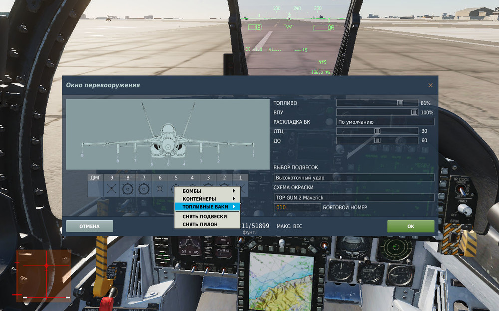 Не отображает в меню топливные баки. Тоже самое с прицельным контейнером. Соответственно ничего не подвешивается, даже если выбрать заранее сохраненную конфигурацию подвески.