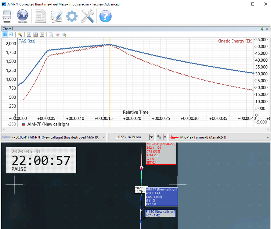 Preface: The main purpose of this post is not to strictly improve the missile performance itself, but to correct values in the AIM-7 missile Lua code that are not accurate to the publicly available information. Any improvement to the performance of the missile should be seen as a side effect and not the intended purpose. This post seeks to compare several public sources on the AIM-7's Hercules MK-58 rocket motor to what is actually modeled in game, and contrast them accordingly. Tests were done using a modified AIM-7F utilizing the "corrected" values to showcase the differences to the vanilla missile. Only the AIM-7F was used for testing as the kinematics between each variant carrying the MK-58 rocket motor are practically negligible. The Tacview files will be provided in this post. The ED AIM-7 vs Public Data: 1. Rocket Motor Burn Time According to ED's missile code (Fig. 1), the AIM-7 has a booster stage burn time of 3.7 seconds, and a sustainer burn time of 10.8 seconds for a total run time of 14.5 seconds not including the 0.2 second delay for the boost ignition and 0.2 second delay for the sustainer ignition. However, according to the "Raytheon AIM-7F Standard Missile Characteristics" data sheet (Fig.2), "AD-A-142508" (Fig.3) and "Gallery of USAF Weapons, 2010 Almanac" (Fig. 4) the stated burn time for the boost stage is 4.5 seconds and the sustainer stage is 11 seconds for a total run time of 15.5 seconds. This is one full second, not including ignition delays, of difference between the ED code and public information. This may be a negligible difference, but there is a conversation about edge cases where the one extra second may matter. Figure 1: Default Eagle Dynamics AIM-7 MK-58 motor code Figure 2: Raytheon AIM-7F Standard Missile Characteristics Engine Ratings Figure 3: AD-A-142508 AIM-7F data sheet Figure 4: Gallery of USAF Weapons, 2010 Almanac AIM-7 data sheet 2. Boost and Sustain Fuel Mass and Mass Ratios Looking at the ED code (Fig.5) boost stage for the MK-58 has a fuel mass of 38.48kg (84.83lbs), and the sustainer stage has 21.82kg (48.10lbs) of propellent for a total mass of 60.3kg (132.9lbs). The sustainer-to-booster propellent mass ratio is approximately 63/37. However, comparing this to the Raytheon propellent masses (Fig. 6) the boost phase contains 52.0lbs (23.6kgs) of propellent and the sustainer fuel mass is 83.0lbs (37.6kg) for a total of 135.0lbs (61.2kgs). The sustainer-to-booster propellent mass ratio with this information is approximately 39/61. The actual masses of propellent in each stage are practically the same with only an error of 7.5%(smaller mass) and 2.3%(larger mass), but reversed in ratio. According to a Canadian study of the Mk-58 Mod 5 rocket motor, there are no listed measurements for the individual propellent masses except for a total fuel mass of 61kg (134lbs). However, the stated sustainer-to-booster propellent mass ratio is 70/30 (Fig. 7) which leads to a booster fuel mass of roughly 18.3kg (40.3lbs), and a sustainer fuel mass of roughly 42.7kg (94.1lbs). Neglecting that the Mod 5 version of the motor may have slightly different masses for each stage, the point stands that the ED MK-58 is coded to have a complete reversal of the publicly available data on the propellent mass and mass ratios for each stage. This will lead to noticeable differences in the performance of each stage as we will see in the test portion of this post. Figure 5: ED AIM-7 fuel mass code Figure 6: Raytheon AIM-7 SMC Fuel data Figure 7: Canadian MK-58 study 3. Boost and Sustain Specific Impulse Values As stated in the ED AIM-7 code (Fig. 8.), the specific impulse for the boost phase of the MK-58 motor is 247 seconds, and 209 seconds for the sustainer phase. Using the ED values, and a gravity value of 9.8 m/s2, we get a boost phase thrust of approximately 25.174kN (5659lbf), and a sustainer phase thrust of approximately 4.138kN (930lbf). Now, according to both the Raytheon AIM-7 SMC (Fig. 2) and the AD-A-142508 (Fig. 3), the stated thrust of the boost phase is 5750lbf (25.577kN), and 1018lbf (4.528kN) for the sustainer. Note that the ED values are underperforming, but can be considered negligible as there is only an error of about 1.6% and 8.6% and motor performance varies with many factors. Using the ED values for both thrust and fuel mass, but correcting the fuel ratios and burn time for each stage, we get a boost phase specific impulse of 530 seconds and sustainer phase of 121 seconds. This is quite a dramatic difference in performance between the actual ED missile and this theoretical "corrected" motor with the boost phase being over twice as efficient, but the sustainer being nearly half as efficient. Now, this may seem as though the performance of the missile may also dramatically improve, but, as we will see in the tests, this is not the case. This is a minimum however as the ED missile uses a lower thrust and fuel mass compared to the public data, so there may be performance left on the table. If we use only public data to formulate the specific impulse of each stage then we get a boost phase of 498 seconds and a sustainer phase of 135 seconds. We will see how this version of the missile compares to the ED one as will. Figure 8: ED AIM-7 specific impulse code In-Game AIM-7F Tests: Test Parameters: Game Version: 2.9.1.48335 Map: Marianas Weather, Date, Time: Mission Editor defaults Launch Platform: F-15C Launch Altitude: ~40,000ft Launch Speed: ~1.5 IMN Target Platform: MiG-19P Target Altitude: ~40,000ft Target Speed: ~1.2 IMN Test 1: Control: Test 2: Corrected Burn Times: Test 3: Corrected Burn Time, ED Fuel Mass, Corrected Ratio: Test 4: Corrected Burn Time, ED Fuel Mass, Corrected Ratio, and Specific Impulse: Test 5: AIM-7F Public Data Only: Conclusions: First, comparing the control missile to the missile from Test 2, we see that the change in burn time yields practically zero difference in peak energy states. However, it can be said that the extra time in the