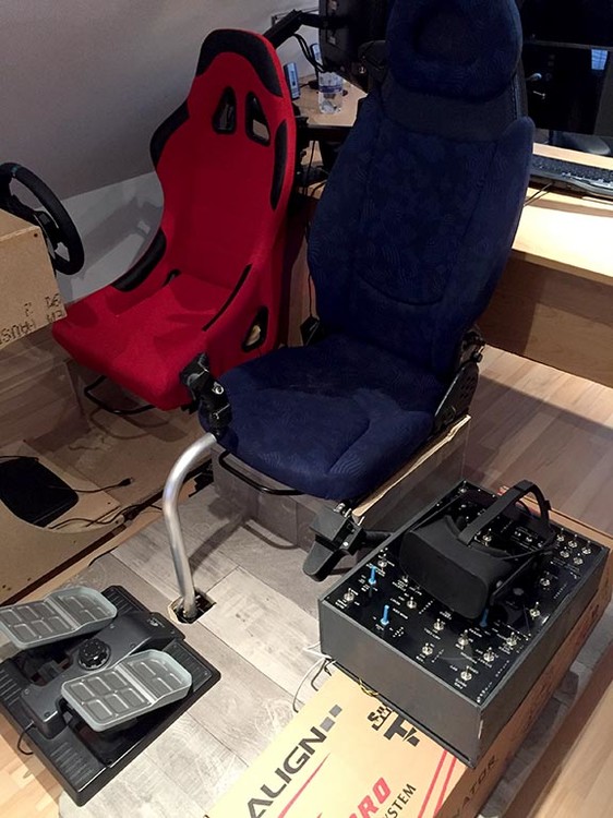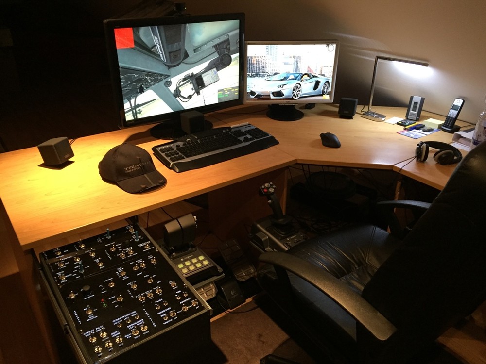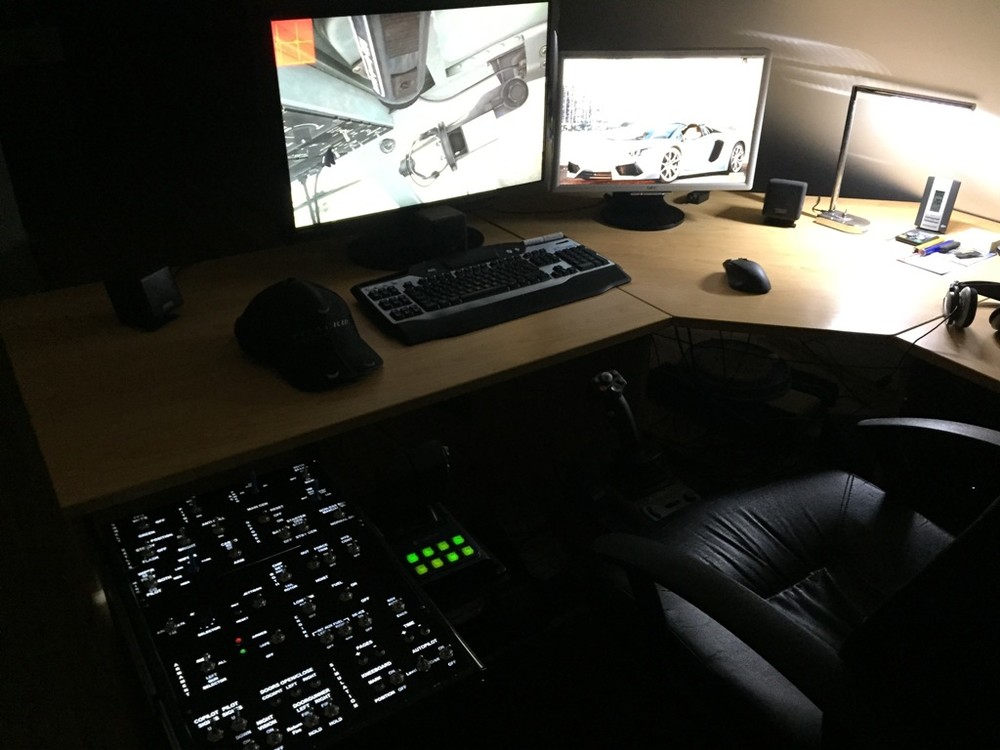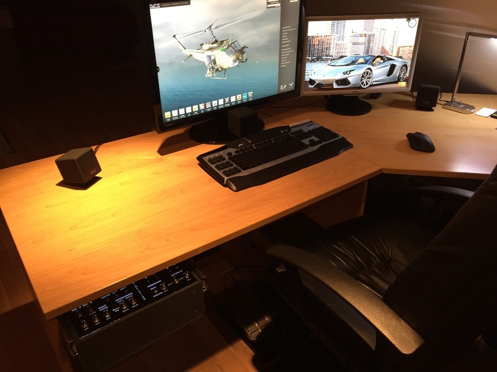 Ich habe an meinen normalen Schreibtischstuhl ein Holzbrett verschraubt auf welchen ich den Stick stellen kann, so dass er optimal zwischen meinen Beinen steht. Links von mir habe ich mir einen Kasten mit diversen Schaltern für die UH-1 gebaut, welcher mit Schubladeneinschüben unter dem Schreibtisch befestigt ist. So kann ich den Kasten bei Bedarf einfach rausziehen und sonst ist er unter dem Schreibtisch verschwunden. An dem Kasten ist wiederum die Halterung für den Schubhebel befestigt. Dieser ist fest verschraubt und verschwindet mit unter dem Schreibtisch wenn der Kasten eingeschoben wird. Zur Erläuterung ein paar Bilder: Gruß Jürgen