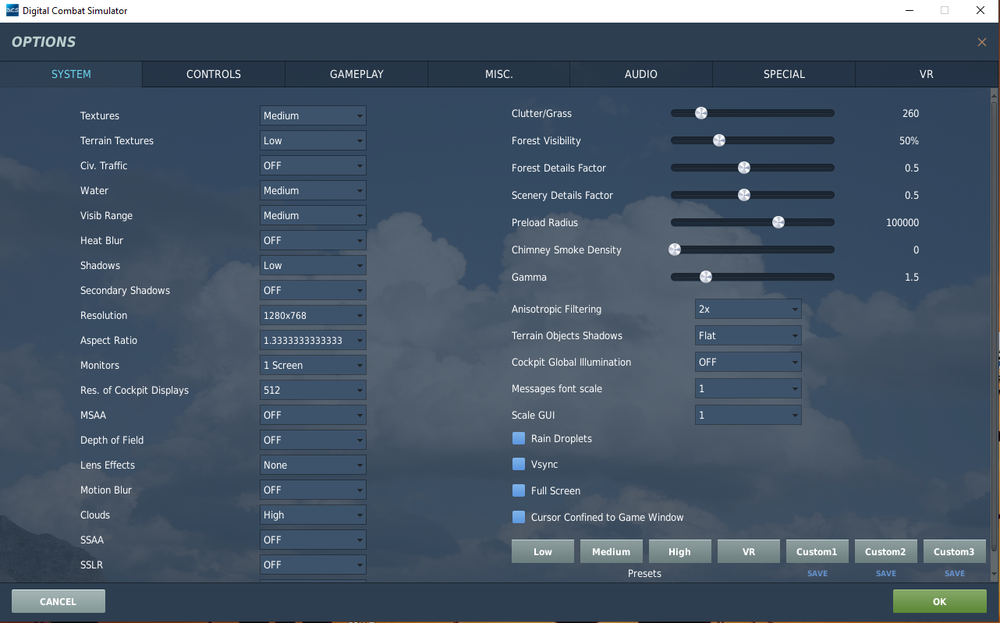 I mostly fly the F14 in Caucasus or Nevada. After your guys’ suggestion I turned MSAA off, and clouds from ultra to high. I think there is some improvement. Textures are medium. In the air over water FPS is hovering between 35-60 Id say. However, on the deck, I’m happy if I get 30. I have a 5700x Ryzen and 32Gb ram. Unfortunately I can’t use OpenXR, as I need SteamVR for my motion SIM. thanks for all the suggestions. -