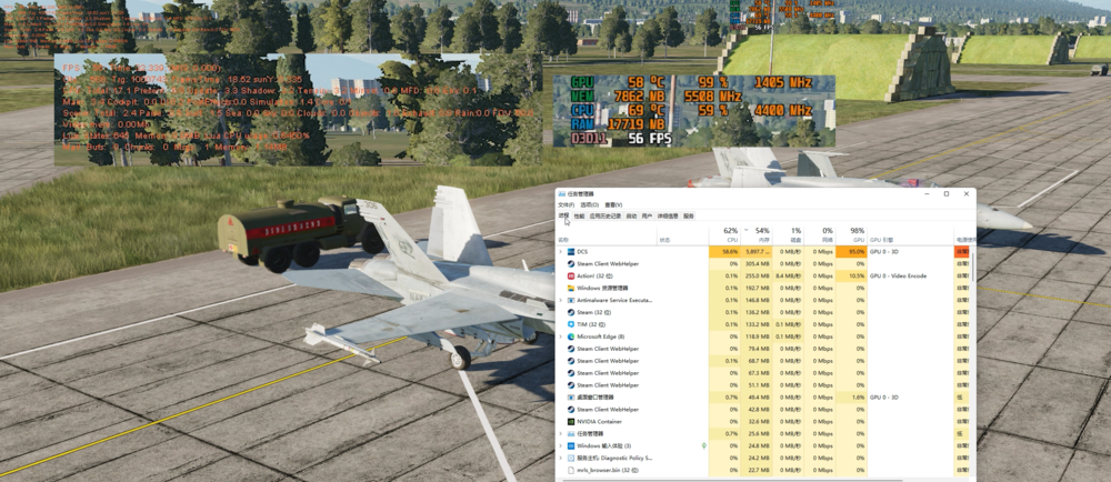 I don not know how many times I have post about the high and unsteady CPU usage of DCS 2.7. And I mention it again because I find something new, ED, please, pay attention to the DCS CPU usage because it seems that there is a bug that can cause the abnormal CPU usage. Press the RCtrl-Pause twice, we can get the detailed statics of DCS CPU usage, and the CPU total never goes above 20, maybe it means in percent%? While if I look the CPU usage from other software, the CPU usage can be very high up to 60 even 80% at some moment for a 8c16t CPU, and tuning the graphic seetings to midum or low don't solve the problem. And I attached a photo shows that the DCS thinks its CPU usage is low to 1X% while actually the CPU usage is up t0 50%. I think DCS might have some component that consumes much CPU usage while DCS cannot monitor it and that cause the leak of CPU usage, which is like to the RAM leak that DCS already exists.