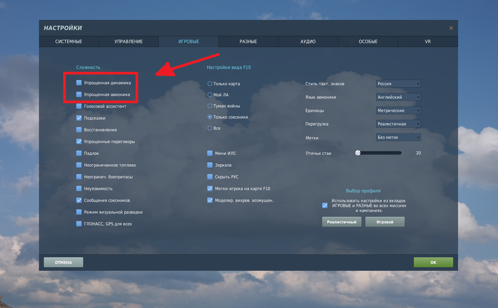 Нужно выключить упрощенная динамика и упрощенная авионика