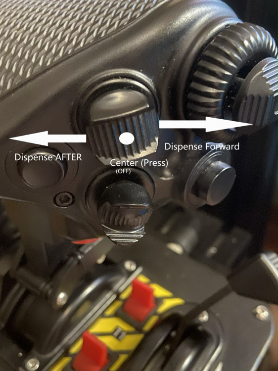 Hello, i recommend to add a individual "center switch" binding for the dispense switch on the throttle like pressing the button. In the current setting, i'm can only move either forward or aft in that swicth that casue me dispense either manual 1 or manual 5 in the manual setting, i can't stop either of them until they stop dispensing by their program. If there is a dedicated seperate center button in the binding, i can interrupt to stop both the Forward and afterward dispense program during their dispensing.