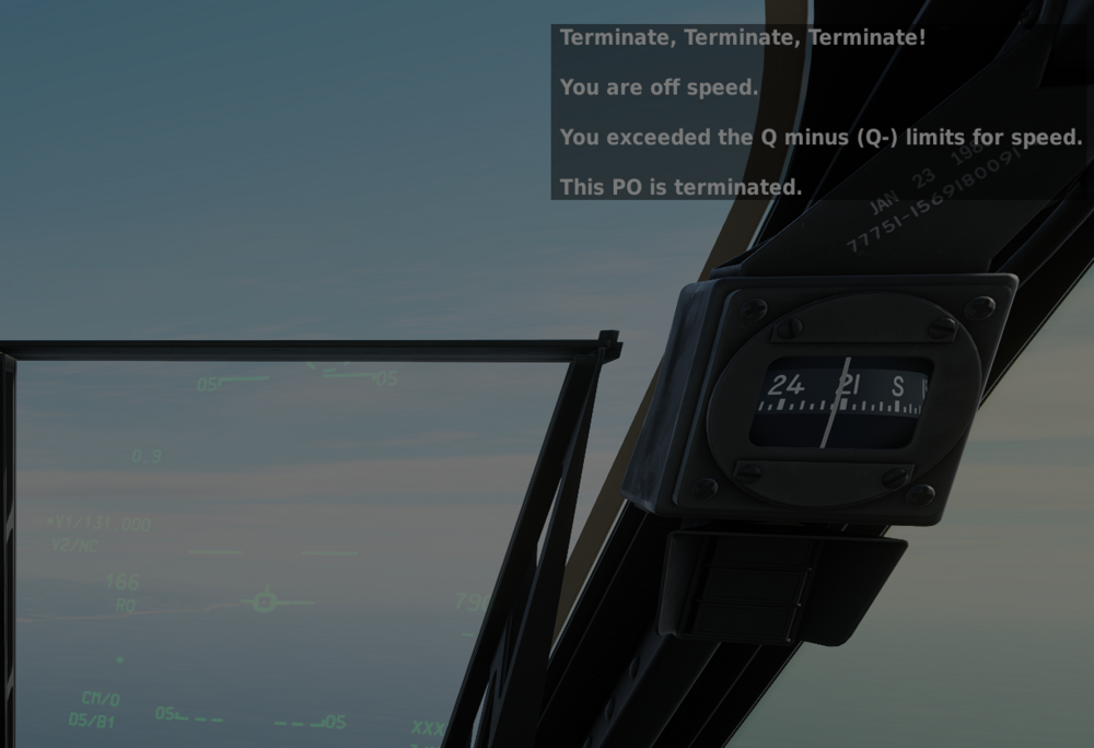 I am getting an angry TERMINATE call at 162 knots, too. So maybe the FM was tweaked again and this needs another look? Took a moment to get the screenshot, and the HUD shows 166. Other speeds have been fine up to this point in the campaign. null -
