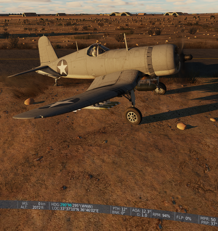 12. Just sitting in the dirt next to the taxiway at Al Dumayr, the tail wheel (unlocked) was jumping and jittering and jerking all over despite being otherwise stationary. I could throttle up to 100% without the plane rolling or nosing into the dirt (no brakes applied). Something is fishy. In other situations, like if the brakes were applied at that throttle setting, it would tip forward and wreck the prop. e: I have attached a screenshot of the situation; throttle and prop pitch reduced while trying to take the screenshot