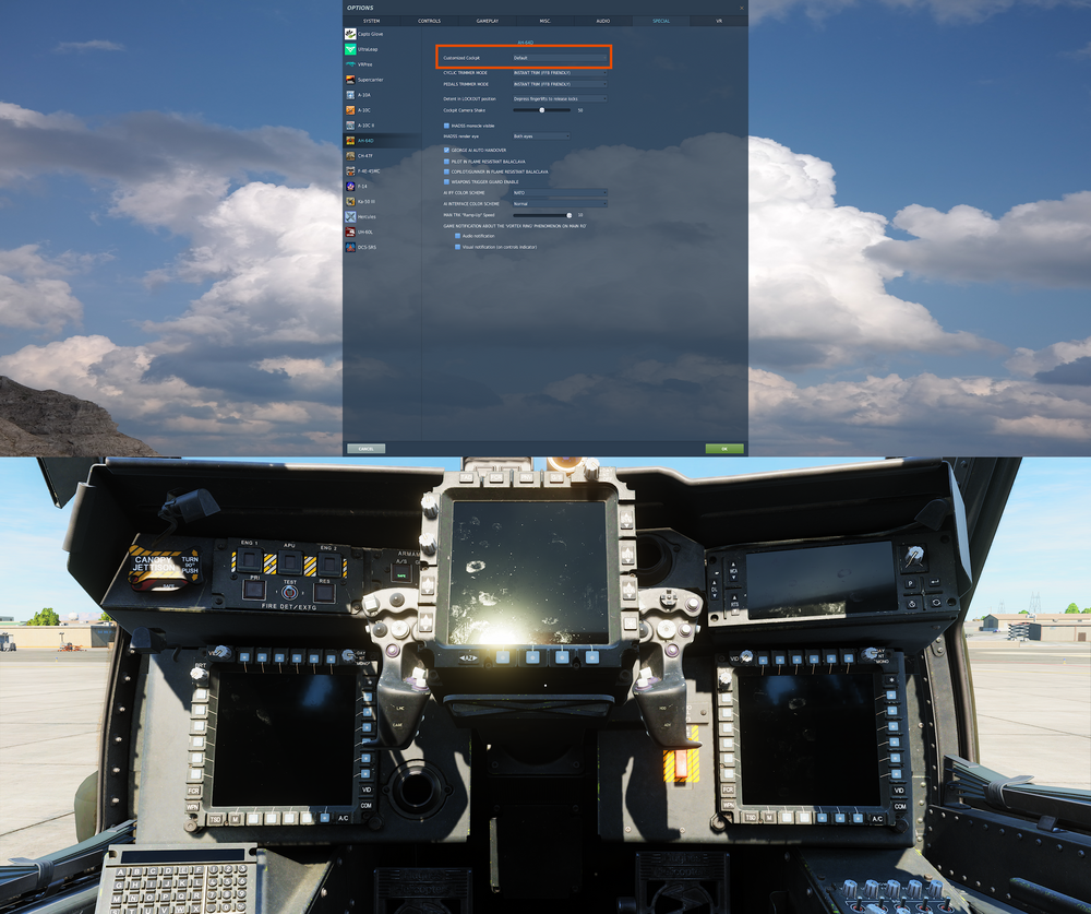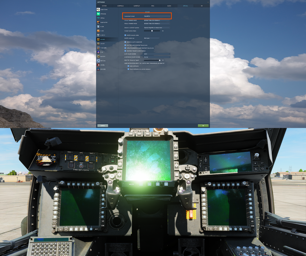 That would work since it goes to the Install directory, but it would also cause Integrity Check issues. Which is the exact reason, I have my mods use the Saved Games directory, for installation. This isn't a saved games vs install directory issue though. The problem here is, the Customized Cockpit option is not functioning properly, for the AH-64D module. This exact same option works for my A-10C, A-10CII, Chinook, and KA-50-3 modules just fine. Shown here, the mod named 'CleanMFDs' has been selected. However, once I load into the AH-64D, the modified textures are not loaded. i If I take that exact same mod, and rename it to 'Default' it works just fine. As seen below.