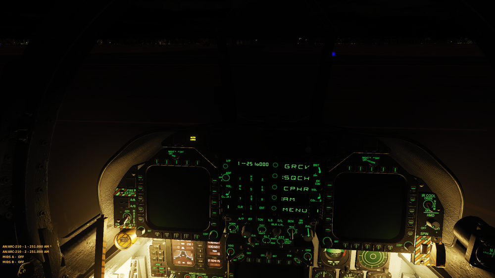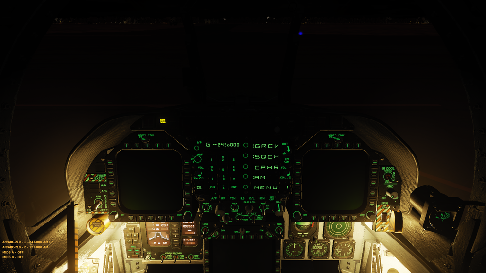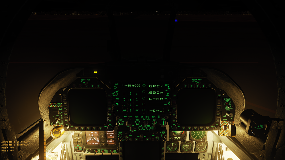 I noticed 2 things yesterday : The first one may be correct as is, but once the hornet has an engine running and radios are powered, both of them aren't listing guard frequency by default. We can then tick "GRCV" mode so the guard frequency is monitored, but it is also ticked automatically whenever you go on "G" channel by rotating the radio knob. I don't know if it means the radio isn't set correctly at startup or if it is correct behavior. The second one is more problematic. I noticed it using SRS mod but it seems to be related to the F/A-18 module, see the associated screenshots with the SRS overlay info : - set the GRCV mode on COMM 1 and select chan 1 on it, which is 251.000, then COMM 1 is monitoring 243.000 ("G" symbol in SRS overlay) - select a channel on COMM 2 and start typing the same frequency that is selected on COMM 1, then even before you press ENT on the UFC, the guard frequency doesn't look like to be monitored anymore according to the SRS overlay, even if it is still on different frequencies since we didn't entered the 251 in COMM 2 channel - when pressing ENT on UFC, COMM 2 then take the entered frequency and if simply pull the channel selection knob on COMM 1, guard monitoring seems to be back. From there, whenever the selected channels of COMM 1 and COMM 2 set the same frequency, the guard monitoring quit as well I noticed that this won't happen if you set both COMM 1 and COMM 2 in GRCV mode, so I think it is a bug related to the displayed frequency and state of GRCV mode for the active radio in UFC display. Note that the GRCV mode isn't changed at all when this frequency equality happens. Here's a track you can also use if it helps in any way.