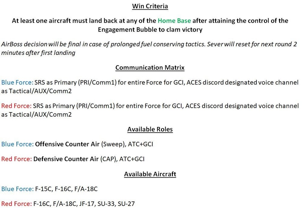 All available Aircrew slots are reserved for now. You can still sign up as reserve pilot for last minute drop outs or in case of any cancellation. See posts below for vacant slots. All SIGNED UP Pilots are requested to join ACES Discord through https://discord.gg/jnDs3aNkEN and request for the Blue Force/Red Force role. Any further details of the setup will be shared on ACES Discord only in dedicated channels. Sign Up for ATC/GCI slot is still open for all.