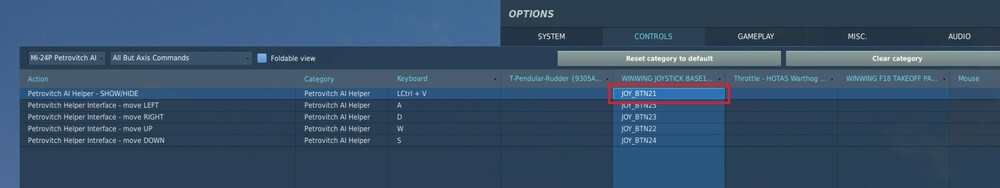 Beim Abstauben des Hinds für die kommende Afghanistan-Map bin ich auf folgendes Problem mit dem Binding der Funktion Petrovitch AI Helper - SHOW/HIDE für den Pilotensitz in der Mi-24 gestoßen: Es geht um das Ein-/Ausblenden dieser Anzeige: 1) Die Tastenkombination LStrg + V funktioniert problemlos... das Petrovitch-Fadenkreuz, samt den Anzeigen, öffnet sich im Bickfeld und schließt sich auch wieder über die Tatstenkombi. Ebenso problemlos funktionieren die Move-Tasten "A", "D","W", "S". >>>Also mit Tastatur ist alles gut! 2) Belege ich die Funktion Petrovitch AI Helper - SHOW/HIDE mit einem Knopf am Stick, am Throttle oder am Tasten-Panel (egal welchen Button ich wähle), dann öffnet sich die Anzeige im Heli nicht. >>>Es erfolgt keine Reaktion auf die Eingabe "SHOW/EINBLENDEN", trotz Bindung! 3) Wurde das Fadenkreuz mit der Tastenkombination (LStrg + V) zuvor geöffnet, dann kann man das Fadenkreuz auch mit dem gebundenen Button an Stick, Throttle oder Tasten-Panel schließen. Ebenso problemlos funktionieren die anderen gebundnen Buttons für Move "Left", "Right", "Up", "Down". >>>Das "Ausblenden" der Anzeige funktioniert mit einem gebundenen Button, das "Einblenden" funktioniert jedoch nicht mit einem gebundnen Button! Weiß jemand, woran das liegen könnte?