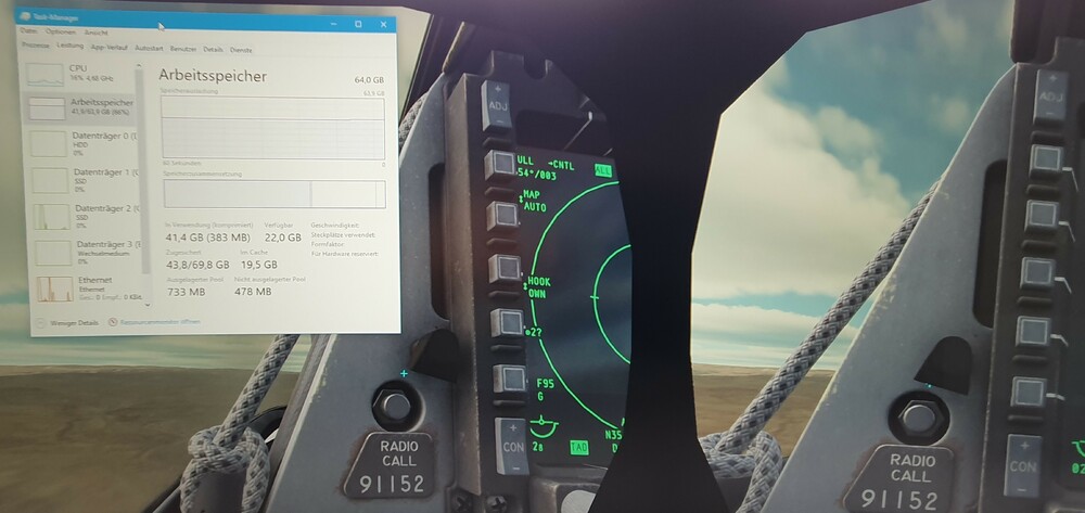 ...und das mit der A-10 und dem Huey, meinen Favoriten...beides nicht gerade als Rennpferde bekannt . ...mhh...ich habe das vor einger Zeit mal beobachtet und fetgestellt, dass meine 32 GB RAM nicht ausreichen...und als ich dann 64GB installiert hatte, kam das raus: 41,4 GB RAM Verbrauch in VR mit der A-10 über Syrien. Aus diesem Grund habe ich überhaupt erst auf 64 GB aufgerüstet ! Es soll also DCS-Simmer geben, die dieses elende Ruckeln nicht haben??? Das wäre schön....das Repro kostet mich nämlich echt viel Leistung...bei mir so um die 15 FPS! Ja, ich habe mich auch schon oft gefragt, ob dass wirklich sein kann, was manche hier an Settings und FPS posten . Ich bin ja eher so der Typ der sich mit 30 Repro-FPS zufrieden gibt, weil ich die Settings möglichst am Anschlag haben will, um die schönstmögliche Grafik zu erhalten ...das ewige streben nach bester Grafik bei gerade noch akzeptabler FPS-Zahl . Daraus schließe ich mal, dass meine HP Reverb G2 (mit 90Hz) bei 90 FPS ohne Repro kein "Ruckeln" mehr hätte, da alles 1:1 umgesetzt würde und theoretisch kein Algoriithmus mehr gebraucht würde...ich habe darüber aber ehrlich gesagt nie nachgedacht, weil ich soviel Grafikpracht nicht für FPS opfern wollte . Klingt aber eigentlich logisch, dieser Ansatz . Könntest Du das spezifizieren...ich meine, gibt es da irgendein Austattungsmerkmal am Mainboard, das dafür verantwortlich ist? Oder ist das einfach nur von Mainboard zu Mainboard unterschiedlich?