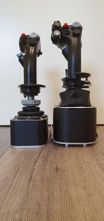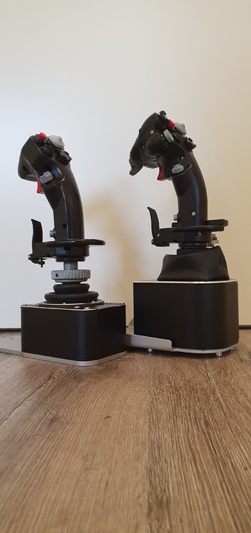 22. Letztendlich bin ich nun auch bei der Super-Libra-Base (mit WinWing F-16Ex-Stick) gelandet und konnte diese auch mit der Virpil-WarBRD-Base (samt TM Warthog-Stick) vergleichen. Links Virpil-WarBRD-Base, rechts WinWing Super-Libra-Base (ohne diesen seltsamen Sticker auf dem Gehäuse): Sicher sind beide Bases von hoher Qualität...und man ist mit beiden Eingabegeräten hervorragend gerüstet. Vielleicht bin ich da etwas "eigen", aber ich persönlich bevorzuge einen möglichst geringen Widerstand des Sticks bei maximaler Präzision um den Mittelpunkt...zwei Dinge die konstruktionsbedingt nur schwer unter einen Hut zu bringen sind. Die Super-Libra-Base beweist aber, dass dies möglich ist. In der "weichsten Einstellung" wobbelt die WarBRD-Base um die Neutralstellung fühlbar herum. Hingegen ist der Mittelpunkt der Super-Libra-Base, selbst in der "weichsten Einstellung", auf wundersame Weise klar fühlbar. Trotzdem ist auch kein "Einrasten" spürbar, denn der Stick braucht immer den gleichen kontinuierlichen Kraftaufwand, egal aus welcher Stellung heraus er bewegt wird. Nun muss ich einräumen, dass die Super-Libra-Base in der "weichsten Einstellung" immer noch etwas "straffer" daherkommt, als die WarBRD-Base. Entgegen den empfohlen Vorgaben von WinWing habe ich deshalb sogar noch einen draufgesetzt und nur eine, statt zwei Federn, eingebaut. Damit ist die WinWing-Base nun vergleichbar "widerstandslos", wie die WarBRD-Base, aber sie besitzt trotzdem noch immer die glasklar fühlbare Neutralstellung! Die feine Rückmeldung der Mechanik an den Nutzer der Super-Libra-Base ist wirklich beeindruckend! Um es nochmals klar zu sagen...im "Alltagsgeschäft" ist ein Unterschied zwischen den Bases nach meinem Ermessen quasi nicht vorhanden...und ich hätte mich auch nicht von meiner WarBRD-Base getrennt, wenn ich nicht den WinWing F-16Ex-Stick mit den annäherd 50 Buttons fürs VR-Fliegen benötigt hätte. Aber genau bei meiner persönlichen Vorliebe für eine butterweiche, leichte Steuerung macht die ausgefeilte Mechanik der Super-Libra-Base den Unterschied...ich weiß, "gepinze" auf hohem Niveau ... PS: Wenn man auf die ganzen EInstellungsmöglichkeiten durch die "Cams" und "Springs" der WinWing Super-Libra-Base und der Virpil-WarBRD-Base verzichten kann und dabei eine präzise, straffe Stickführung bevorzugt (...wie es wohl die meisten Simpiloten tun), dann ist die WinWing-Orion-Base eine überlegenswerte Alternative zur Super-Libra-Base und der WarBRD-Base.