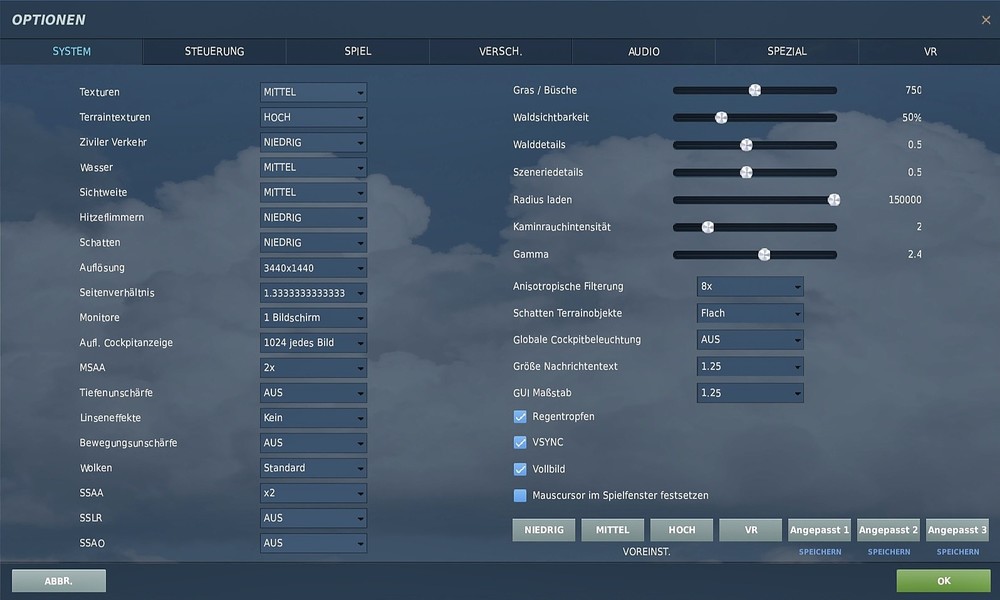 Ich nutze diese Einstellungen: Ich liege damit in VR mit dem Jet zu über 95% bei stabilen 45 FPS, beim Heli sinken die FPS manchmal auf 35 FPS ab, weil man damit ja fast immer im Tiefstflug unterwegs ist und große Städte fordern da halt manchmal ihren Tribut (hängt auch immer etwas von der genutzten Map ab). (PC-System: Siehe Signatur) Ich werde aber auch geren mal Deine Einstellungen testen...unsere System sind nicht so verscheiden...ich versuche immer das lästige Kantenflimmern (an feinen Objekten, wie z.B. Zäunen und Antennen) in VR soweit wie möglich zu unterdrücken...