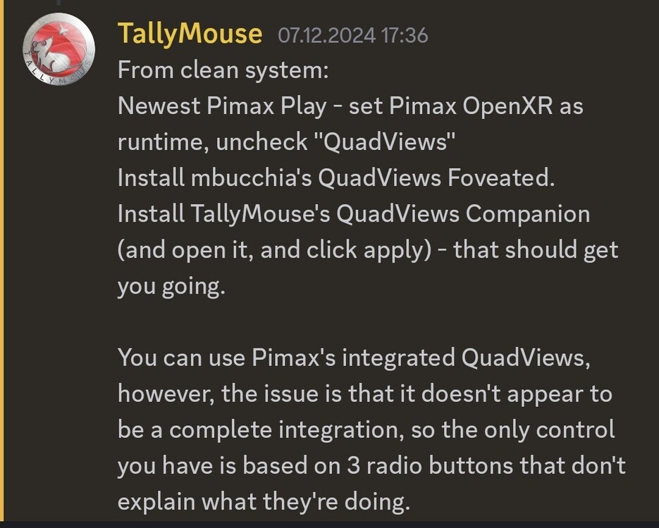 Hier ein paar News und Updates zum Thema Quadviews und Pimax. Es gibt eine neue Quadviews-Companion-Version: https://github.com/TallyMouse/QuadViewsCompanion/releases/tag/quadviews Aktuell nutzt man Eyetracking und Quadviews mit einer Pimax-Brille, lt. TallyMouse, so: CLEAN-SYSTEM bedeutet: Ich habe PimaxPlay+QuadViews Foveated+QuadViews Companion heute genauso eingerichtet, wie oben beschrieben und es läuft einwandfrei! Hier noch was zur kommenden Pimax-Crystal-Super: ...erste Auslieferungen an die Kunden sind für Januar 2025 geplant !