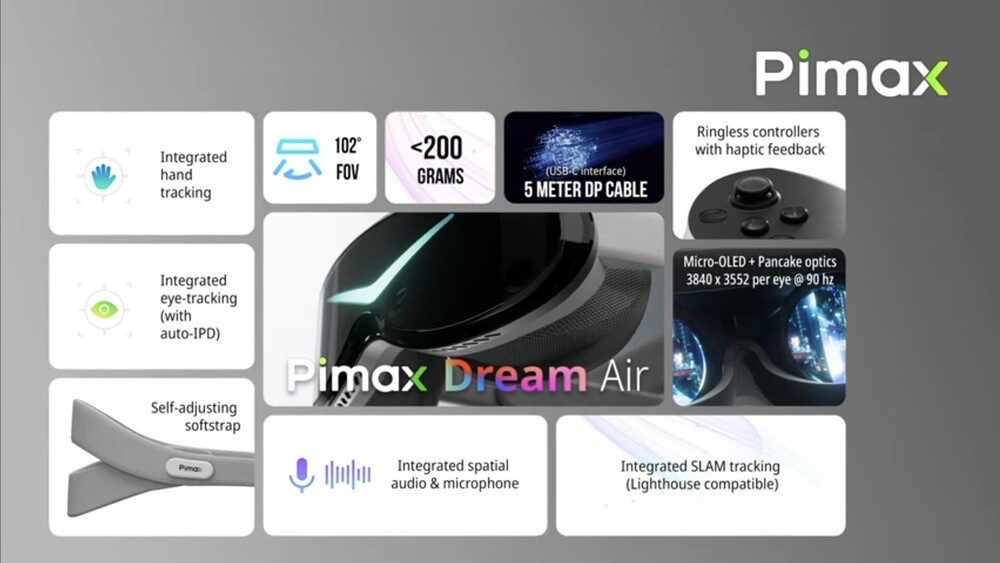 Die "Dream Air" zielt auf die "Shiftall/Panasonic MeganeX 8K" ab. Beide nutzen die gleichen Micro-OLED Panels. Der große Vorteil von Panasonic/Shiftall gegenüber Pimax war bisher der kleinere, leichtere Formfaktor der "MeganeX 8K" gegenüber der "Pimax Crystal Super". Pimax versucht das mit der "Dream Air" nun auszugleichen und mit Eyetracking (was die MeganeX nicht hat) zu übertrumpfen. Ist für 1899.- Euro vorbestellbar, erste Brillen sollen ab Januar ausgeliefert werden.
