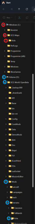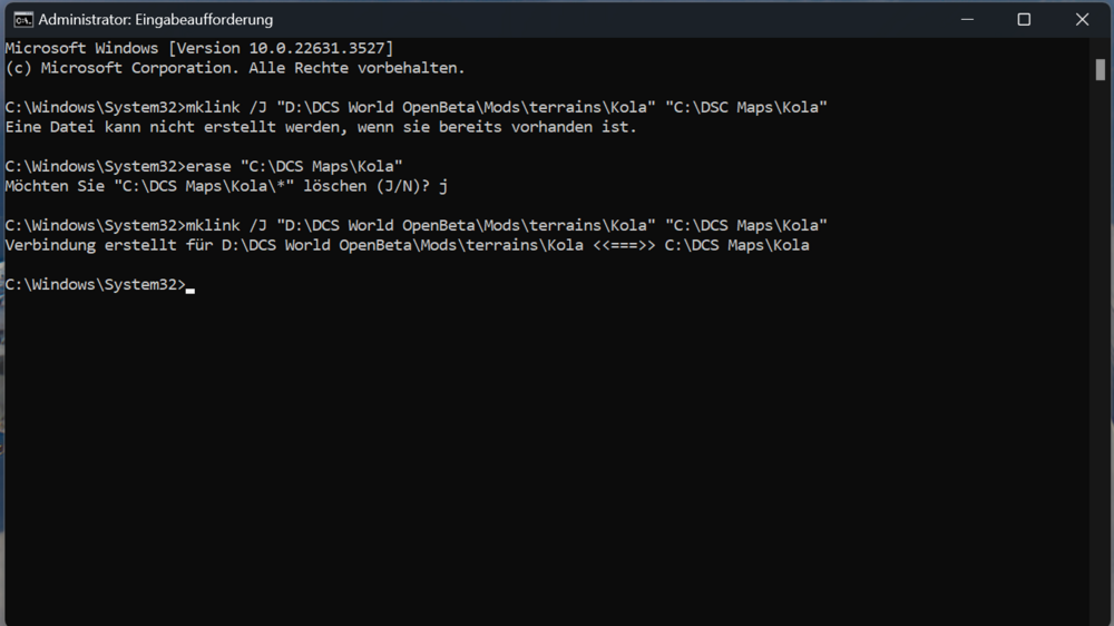 In Kürze grundsätzliches zum Symlink: Symlink erstellen Das Problem: Mein DCS-Laufwerk (D:) hat eine Kapazität von 1TB, davon sind mittlerweile gut 730 GB belegt. Auf dem Hauptlaufwerk (C:) sind noch 1300 GB frei. Mit der Afghanistan-Map (möglicherweise auch rund 150GB), dem Kiowa, der Phantom und dem Chinook wird die Kapazität meines DCS-Laufwerks bald erschöpft sein. Dann müsste ich eigentlich das 1TB-Laufwerk gegen ein größeres austauschen und alles neu herunterladen/installieren . Mit Symlink könnte ich das (theoretisch) umgehen, indem ich z.B. die 140GB Kola-Map von meinem Laufwerk D auf das Laufwerk C verschiebe und DCS über einen Symlink mitteile, wo es die verschobene Datei findet...soweit die Theorie! Gedacht, getan: Ich habe die Kola-Map von D:\DCS World OpenBeta\Mods\terrains\Kola nach C:\DCS Maps\Kola verschoben. Sieht dann so aus: BLAU: Da war die Kola-Map vorher, ROT: Da ist die Kola-Map nun. Dann habe ich den Symlink erstellt (4. Zeilenblock): Der Eingabeaufforderung nach, war der Symlink erfolgreich, denn man kann auf dem hochgeladenen Screenshot meines Datei-Verzeichnisses (siehe oben) auch das "Linksymbol" an der mit blau markierten Kola-Map-Datei im DCS-Ordner erkennen, das auf den neuen Speicherort auf dem Laufwerk C verweist. Trotzdem ist die Kola-Map in DCS nicht für mich mehr verfügbar . Hat jemand Erfahrung mit einem Symlink in DCS und weiß, warum die Kola-Map in meinem DCS-Menü nicht erscheint? Wo liegt mein Fehler?