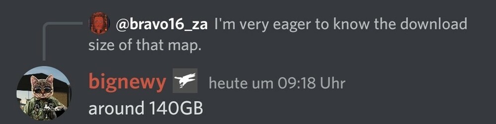 Interessehalber habe ich mir mal die Datenmengen der DCS-Maps auf meinem PC angesehen: Caucasus: 17,5 GB Falklands: 80,6 GB Kola: 143,0 GB Mariana Islands: 14,3 GB Nevada: 34,3 GB Normandy: 44,4 GB Persian Gulf: 31,9 GB Sinai: 55,0 GB Syria: 66,2 GB Channel: 21,7 GB