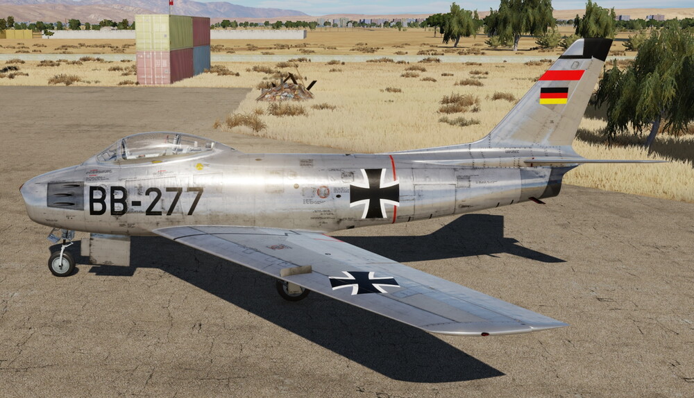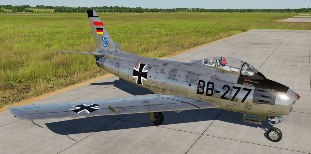 German F-86 Sabre Skin Pack By request I'll do a Germany skin pack for the F-86F. Thanks to Aviator78 for giving me some informations regarding German Sabres. Version History v2: Missing texture for pylon and fuel tank fixed. JA-245 of II.JG71 added v1: Initial release with BB-277 and BB-387 of Waffenschule der Luftwaffe 10 (WaSLw 10) Download https://www.digitalcombatsimulator.com/en/files/3328687/