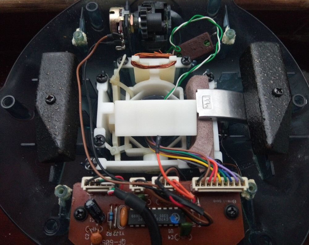 Внутреннее устройство руда - с правой стороны под металлической скобой резиновый блок с намотанной поверх замшевой (либо шагреневая,либо набук,либо сафьяновая) кожей розового цвета,который входит в трение с механикой ручки и не дает ей падать,заваливатся продольно, а держатся на месте... Металлическая скоба прижата грузиком самого джойстика.Все хлипкие элементы джойстика закрепляются суперклеем.Проволокой заблокирован поперечный ход ручки,а крючки продольного хода притянуты хомутами к рамке,для дополнительного сопротивления с другой стороны во время хода..