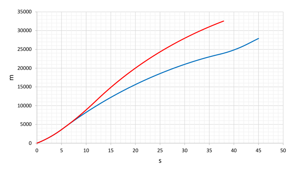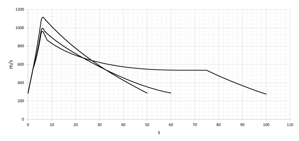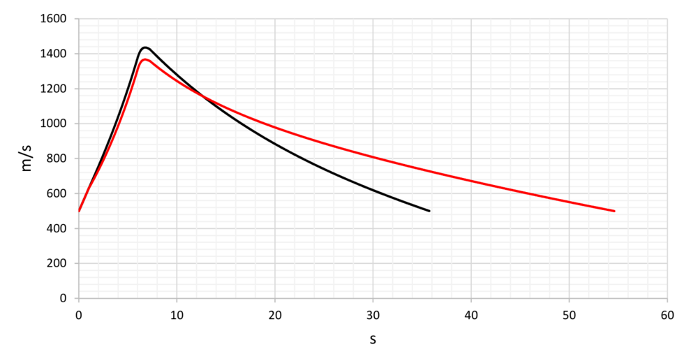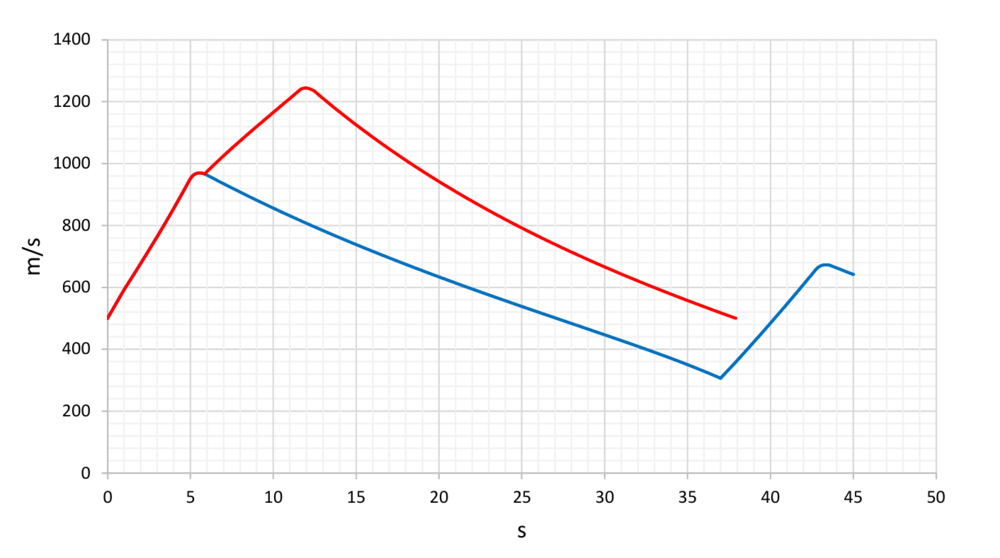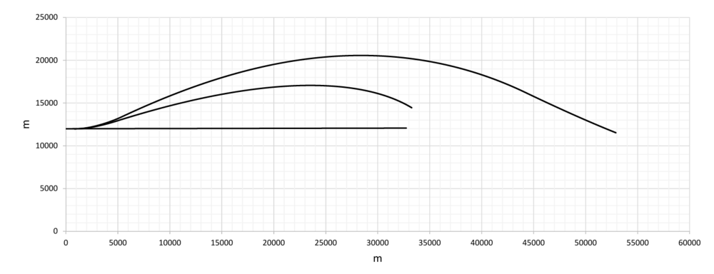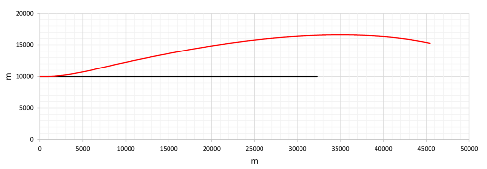 I thought it will be perfectly clear, anyway, red curve is case if second impulse would be started immediately after first one is finished. Green curve is case if second impulse would be started in 25th second and of course blue curve is with started second impulse in 45th second. One more realistic situation, levelled flight at 10km and starting velocity 500m/s First and second impulses one after another, something like dual thrust motor...and case if second impulse would be started when velocity drop to approximately 1M Combined cases -> Obviously dual impulse is with intention to make rocket with more potential in time when it counts the most, in time when target suppose to be hunted. Fact is that such concept, I think in most cases, gives shorter range and rocket is less agile considering total flight time, but when it matters then such rocket is with potential